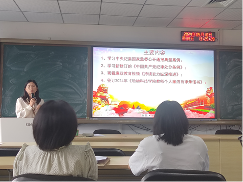 2024年5月9日,动物科技学院党总支在现代畜牧科技大楼412会议室召开2024年度专题警示教育会,会议由动科院党总支纪检委员张崇英主持,动科院全体教职工参会。