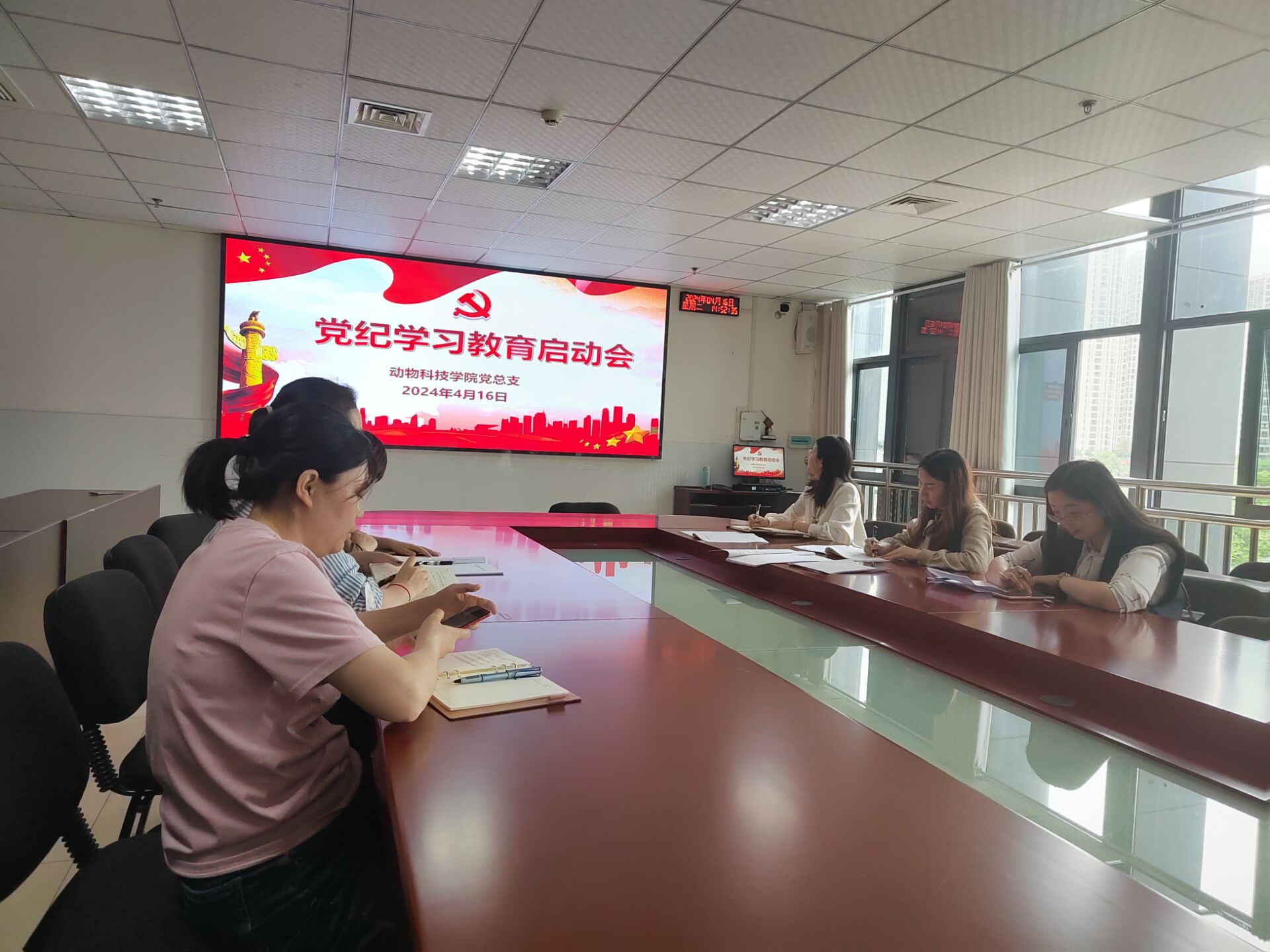 2024年4月16日下午,动物科技学院党总支在现代畜牧科技大楼412会议室召开展了党纪学习教育启动会,会议由动物科技学院党总支副书记李思琪主持,党总支各委员、各支部书记参加了会议。