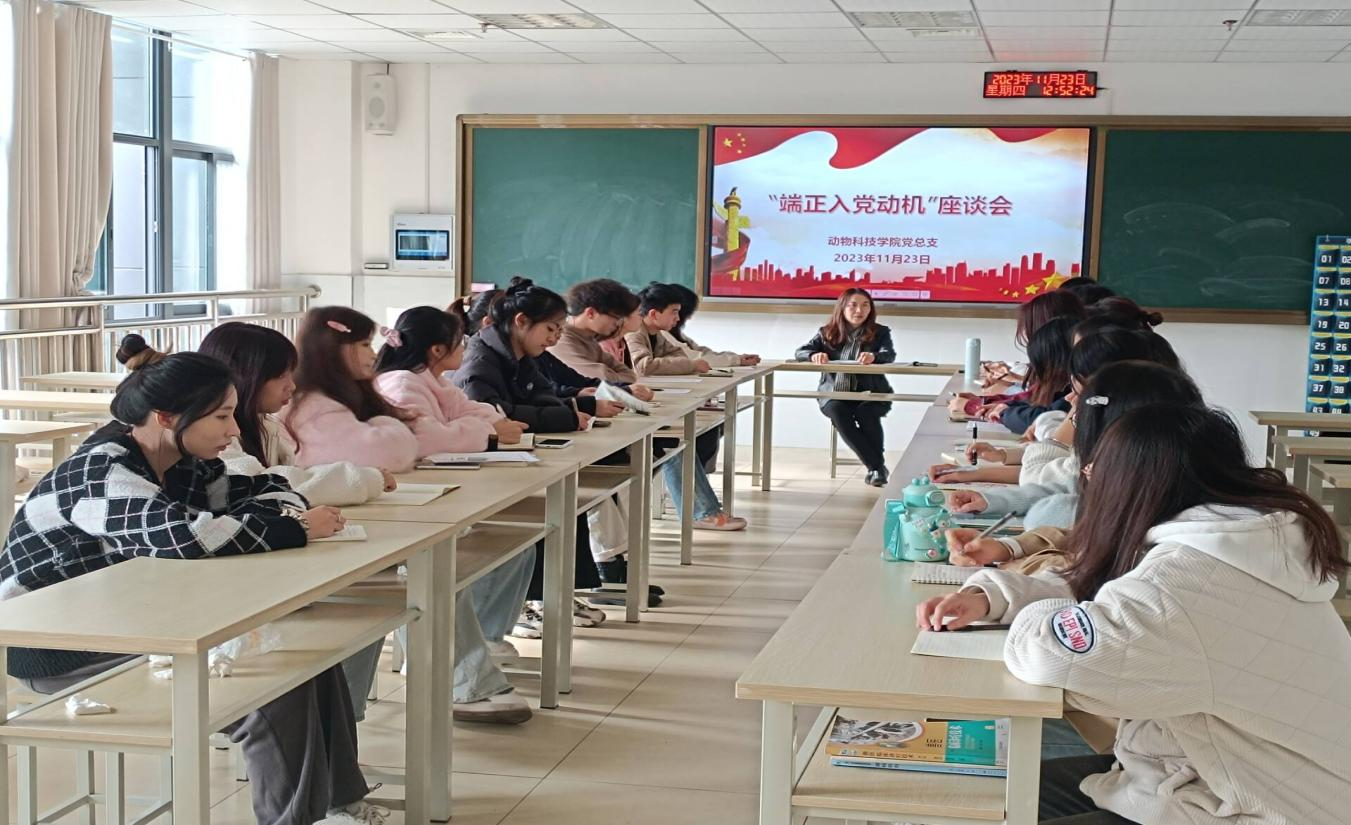 2023年11月23日,动物科技学院在动科楼607开展了“端正入党动机”主题座谈会,本次主讲人动物科技学院专职组织员谭丽老师围绕端正入党动机的意义、正确的入党动机以及如何端正入党动机三个方面,让入党积极分子进行了充分的交流和探讨,并给予在场参会同学殷切希望,要求各位入党积极分子能够树立正确积极的入党动机,坚定理想信念,将党的宗旨和原则贯彻在自身实践中,积极投身于在为人民、为社会、为共产主义而不懈奋斗的道路上。