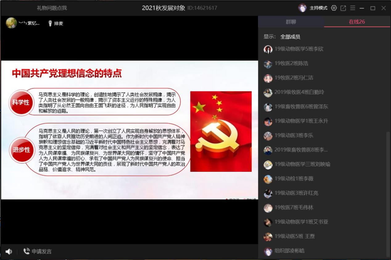 为了深入贯彻落实《中国共产党发展党员工作细则》和学校党委党员发展工作要求,提高党员发展质量,2021年11月15日至26日,动物科技学院党总支在动科楼101教室开展本学期党员发展对象短期集中培训。