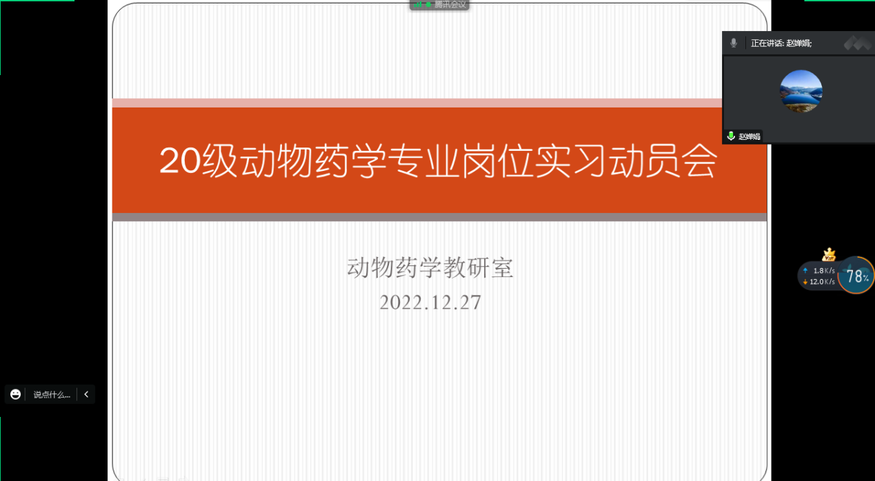 为保证2020级动物药学专业学生实习安全,让学生进一步明确实习的目的和意义。2022年12月27日,动物科技学院动物药学教研室召开2020级动物药学专业岗位实习动员会,动物药学专业专任教师及2020级动物药学专业全体学生参加会议,大会由动物药学专业教研室主任赵婵娟老师主持。