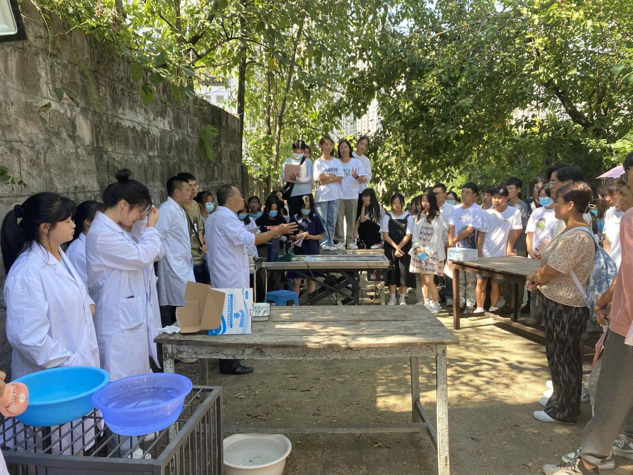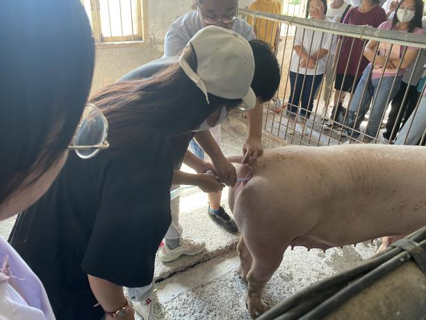 该活动于上午8:30准时开始,2021级畜牧兽医专业学生以班级为单位,在相关负责教师的讲解和演示下,先后参观了“教学动物医院”、“爱丽宠屋”、“竹园实训室”,主要了解了动物医院的设计、接诊流程、仪器设备,宠物店的设计、宠物美容等,观看了仔猪疝气手术及猪的人工授精技术等。