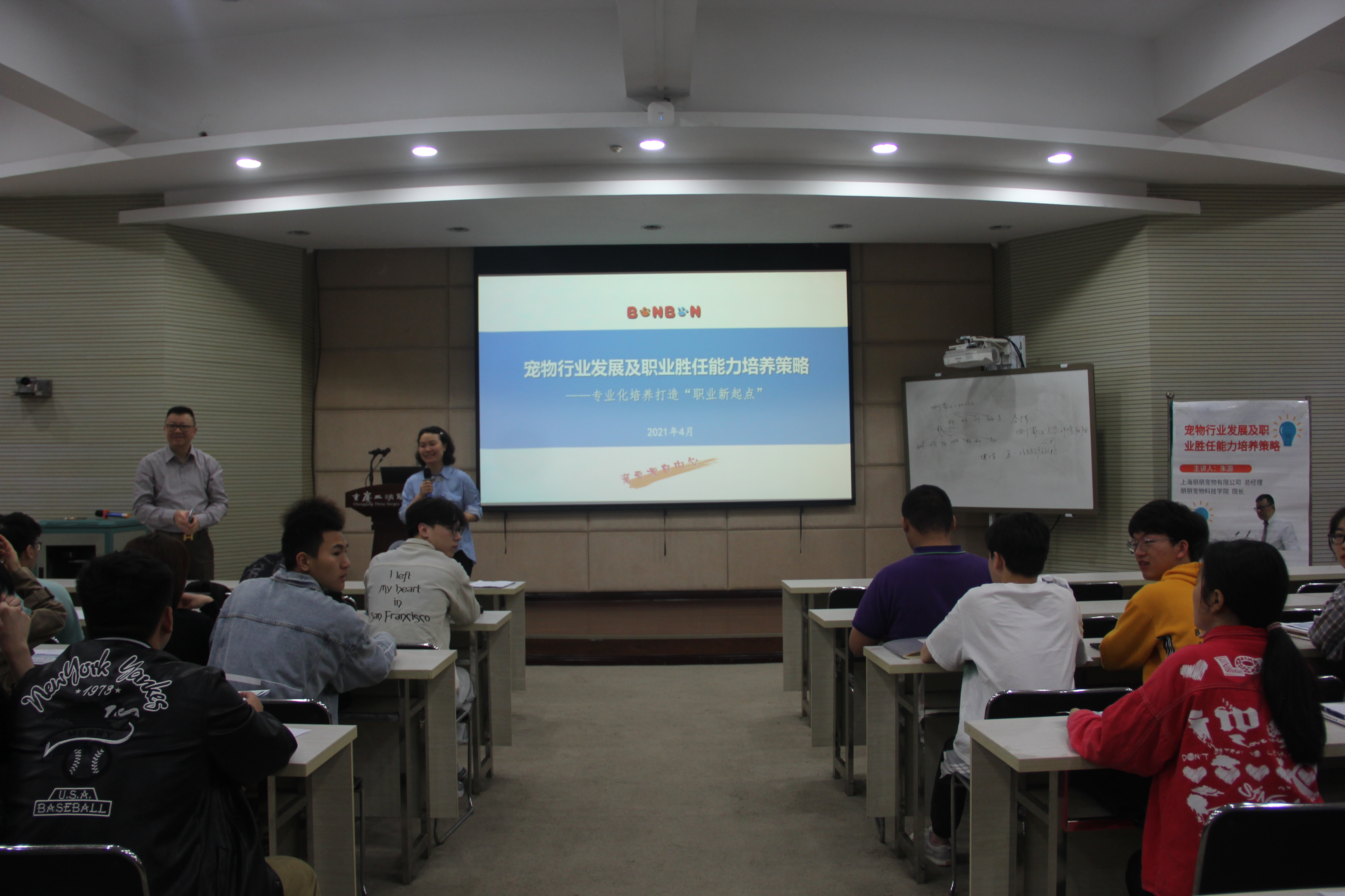 朱院长详细地介绍了上海朋朋宠物有限公司的各项优势,结合宠物行业目前宠物吃穿住行医的现状与宠物的主要消费群体来分析宠物行业存在意义与未来发展趋势,使同学们对宠物行业未来发展潜力有了更深入的了解与认知。