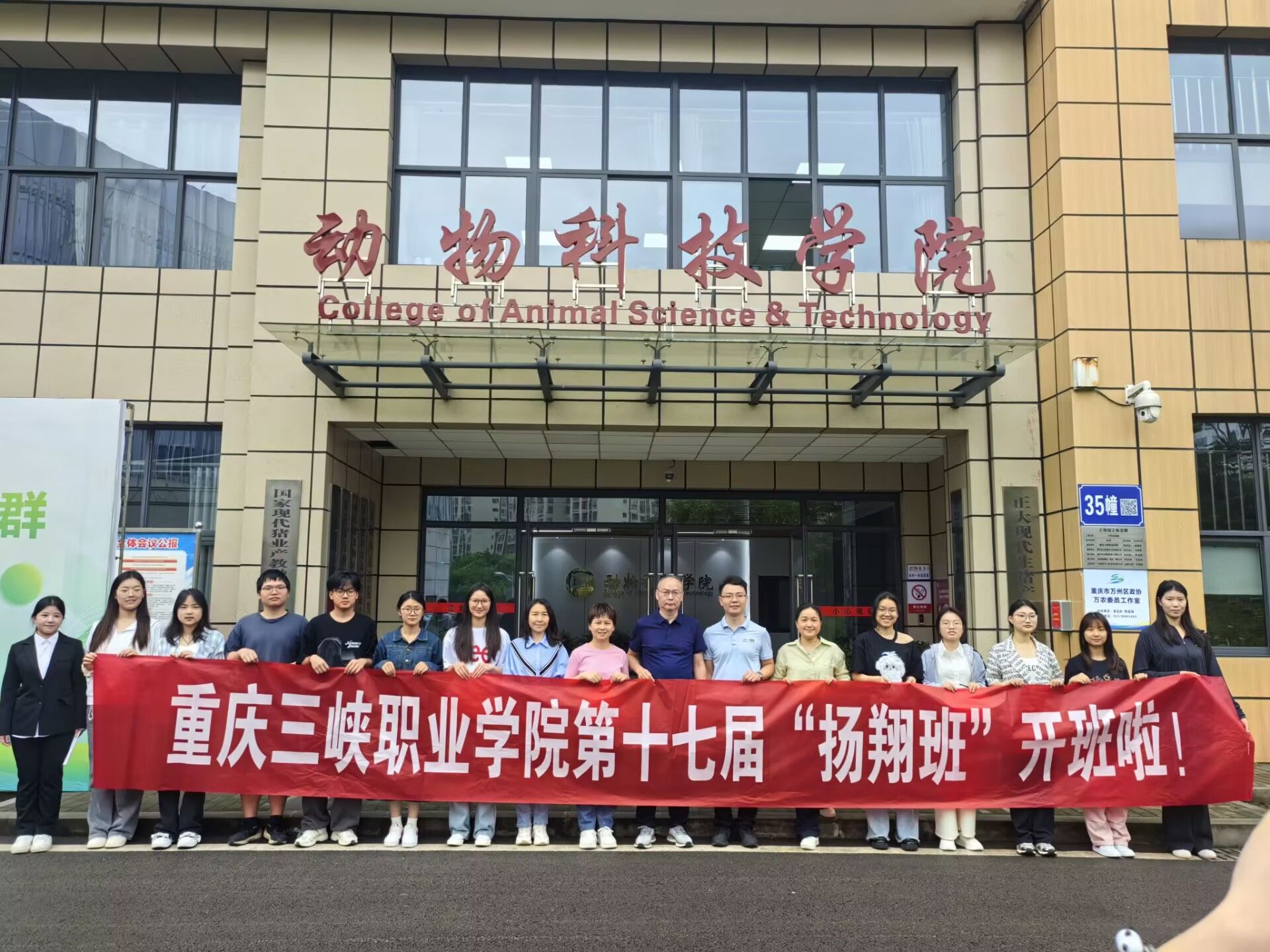 最后,学院第十七届“扬翔班”全体成员在现代畜牧科技大楼前合影留念。