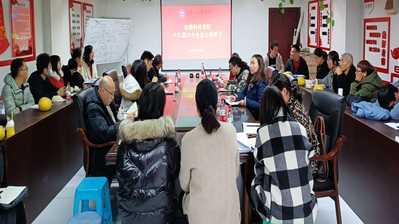 为深入学习贯彻落实党的十九届六中全会精神,全面了解全会重要历史背景和意义,   20211122日下午,动物科技学院党总支在动科120室开展十九届六中全会精神专题学习,动科院全体教职工参与本次学习。