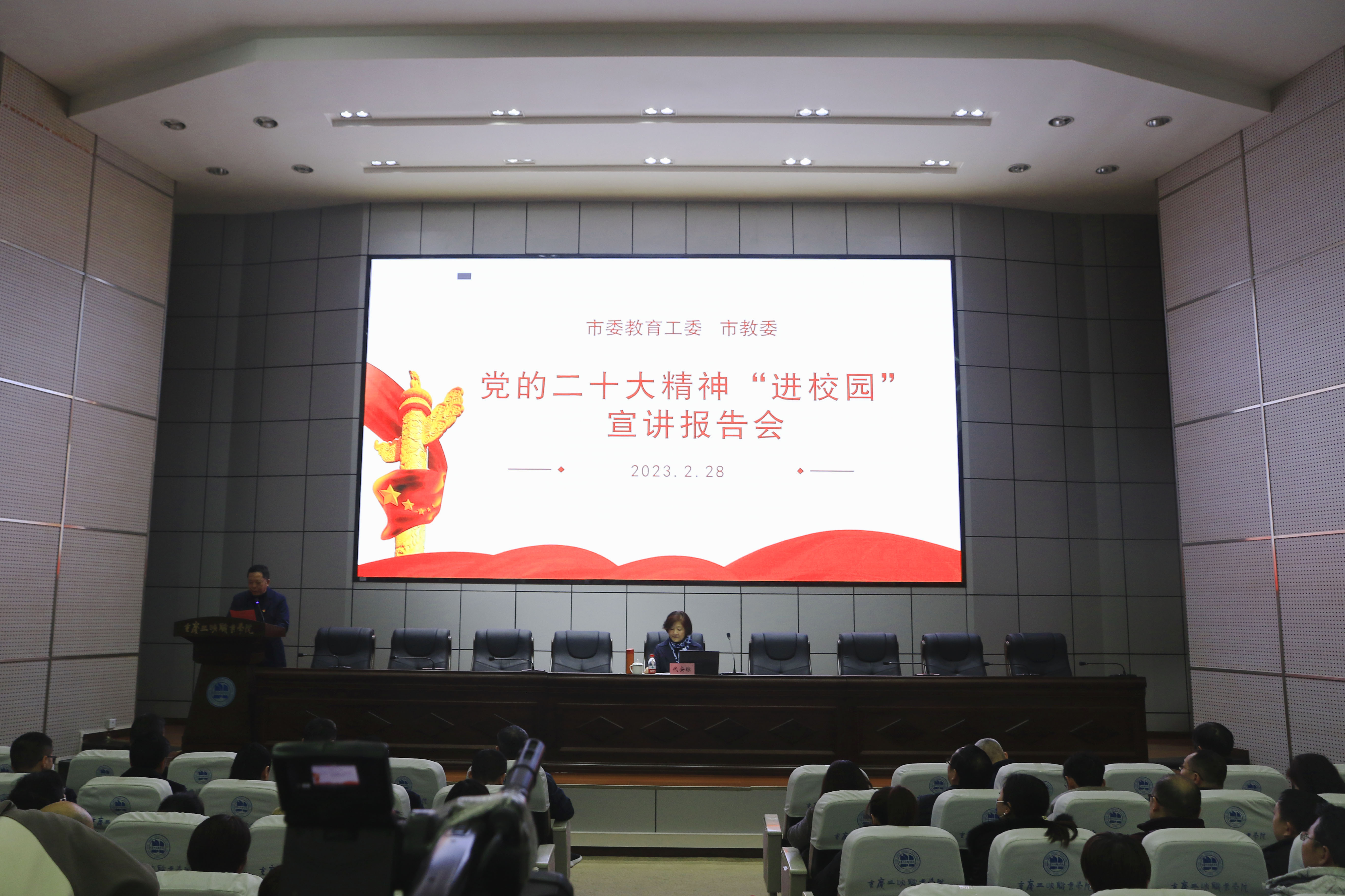 为深入学习贯彻党的二十大精神,切实把广大师生的思想和行动统一到会议精神上来,按照市委教育工委、市教委学习贯彻党的二十大精神“进校园”宣讲工作安排,2月28日,市委教育工委市教委宣讲队成员,重庆医科大学马克思主义学院党委副书记、院长代安琼为我院师生作党的二十大精神专题宣讲。学院在家院领导、中层干部、党外代表人士、全体专职辅导员、全体思政课教师以及学生代表共350余人参加学习活动。宣讲会由党委书记陈章主持。