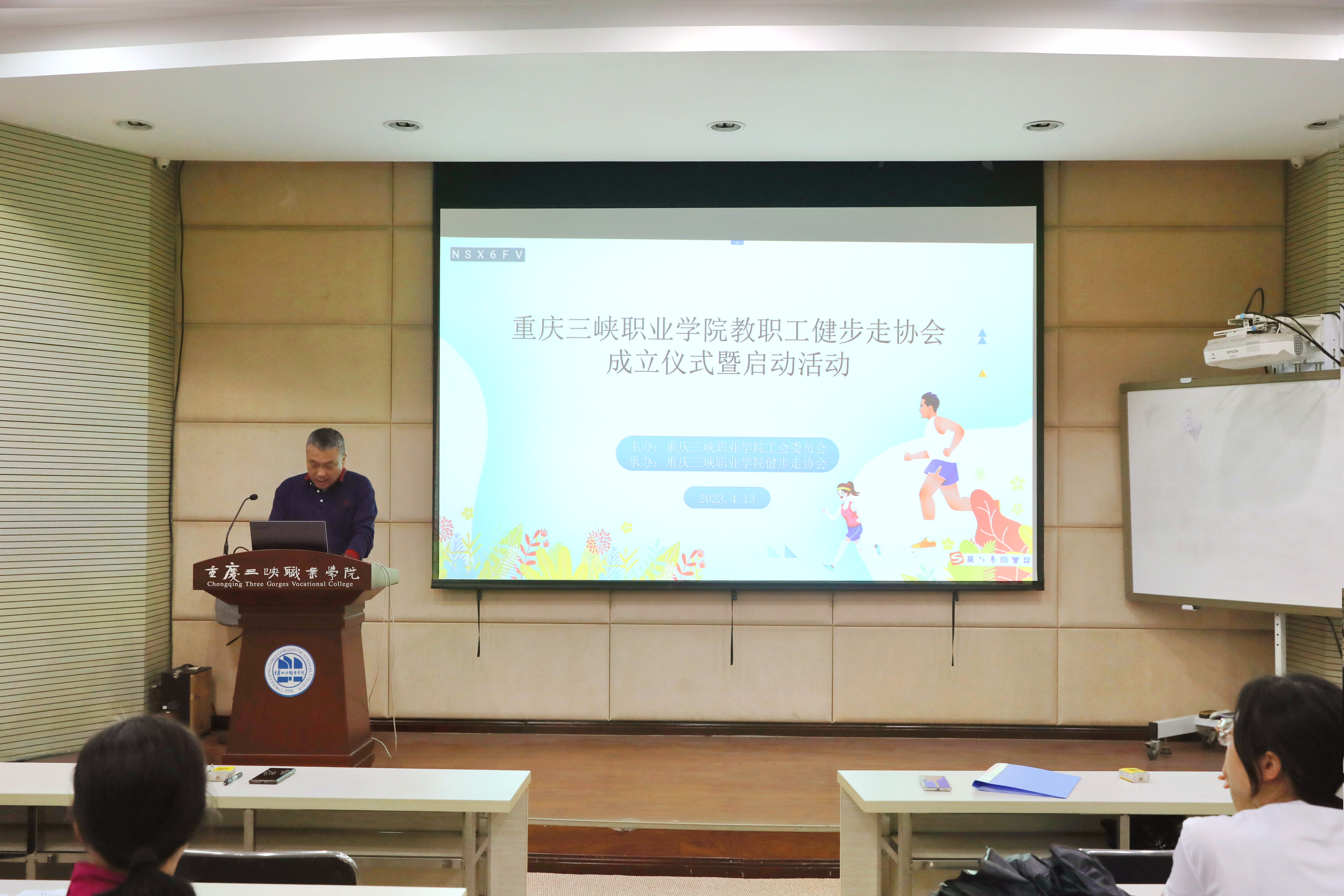健步走协会会长莫才旭宣读《倡议书》,号召全体协会会员立即行动起来,从现在开始,积极开展健步走活动,增强自身体质,以健康的体魄、饱满的工作热情、乐观的心态,积极为学院的发展建设作贡献。