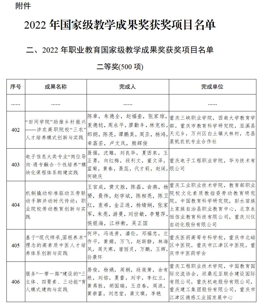 《教育部关于批准2022年国家级教学成果奖获奖项目的决定》日前发布,国家级教学成果奖评审委员会评审确定的2022年国家级教学成果奖项目,已经公示并完成异议处理。2022年职业教育国家级教学成果奖共计572项,其中特等奖2项,一等奖成果70项,二等奖成果500项。我院联合西南大学教育学部、重庆市教育科学研究院等单位共同申报的教育教学项目《“田间学院”助推乡村振兴——涉农高职院校“三农”人才培养模式创新与实践》荣获二等奖。