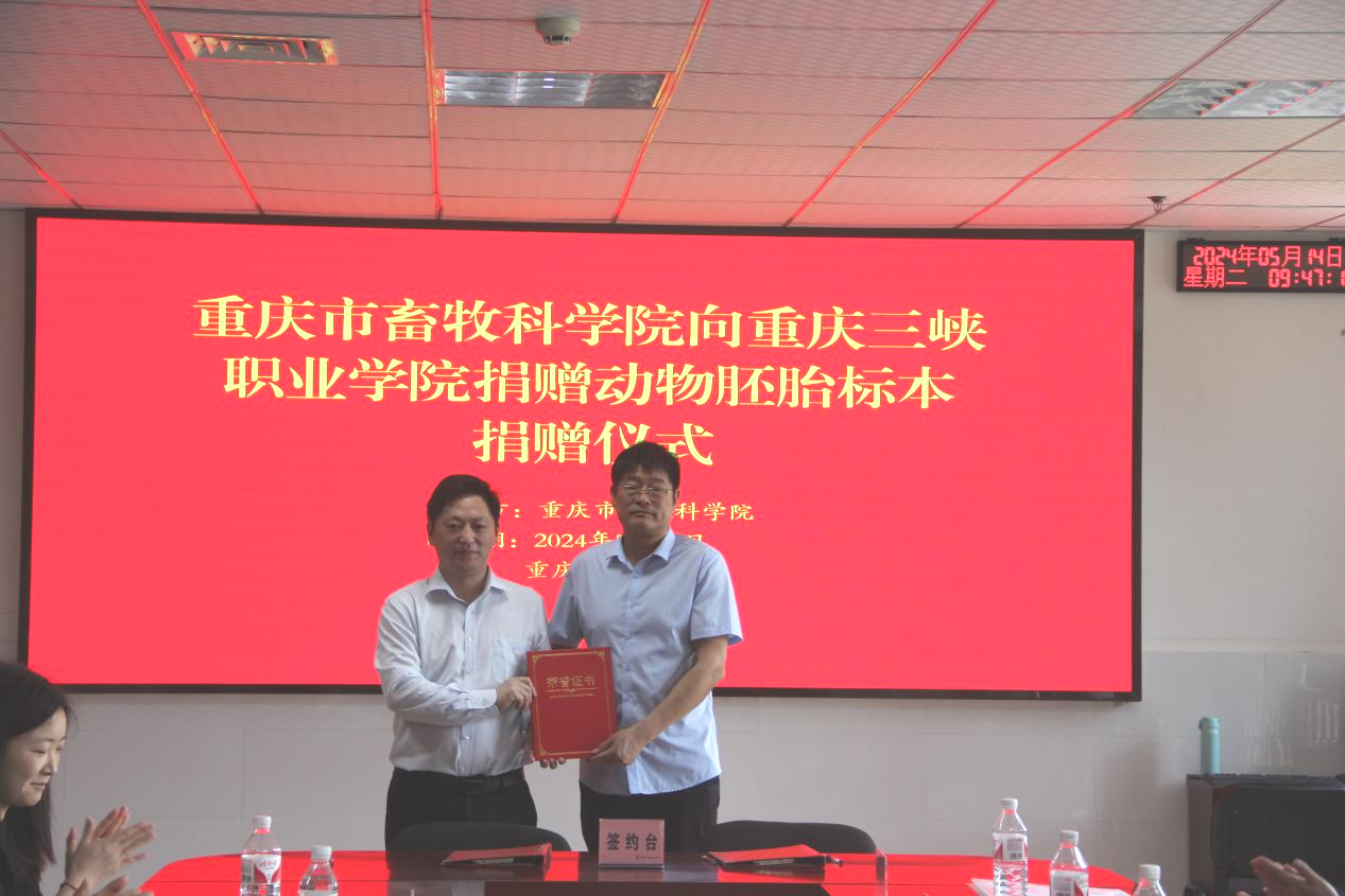 在众多参会嘉宾的见证下,双方顺利签订了捐赠协议,副院长张传师为重庆市畜牧科学院颁发了捐赠证书。