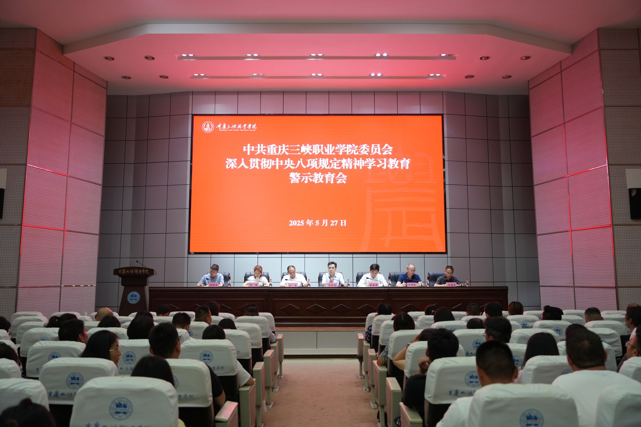 根据学校党委深入贯彻中央八项规定精神学习教育工作安排,5月27日下午,学校党委召开深入贯彻中央八项规定精神学习教育警示教育会。党委书记谈建成主持会议并讲话。学校科级以上领导干部、重点岗位人员和党员代表300余人参加会议。