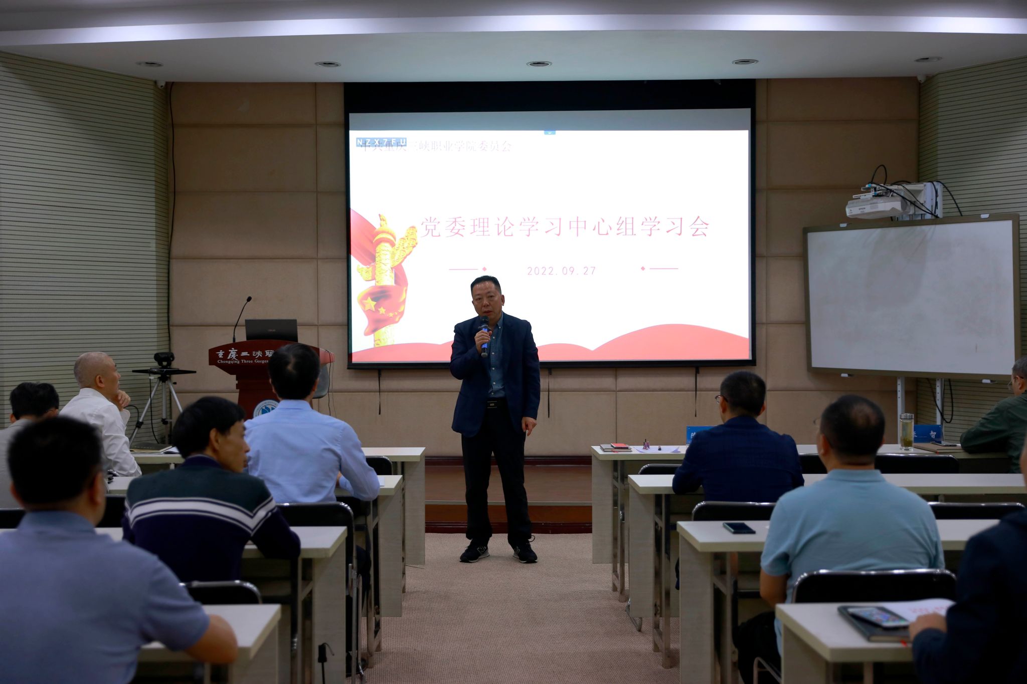 学院党委委员、副院长赵福奎围绕学习内容中心发言,党委委员、统战部部长杨吉林、对外交流合作处处长谭军、智能制造学院党总支书记、院长熊江,围绕学习内容交流学习体会。
