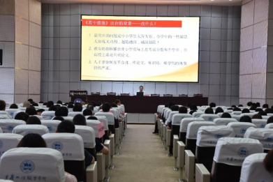 重点讲解了《若干措施》的主要内容和精神,对文件的总体要求、推进党委和政府教育工作评价改革、推进学校评价改革、推进教师评价改革、推进学生评价改革、推进社会选人用人评价改革和推动改革任务落实落地七个方面的内容进行了详细分析和讲解。