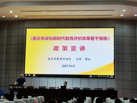 按照市委教育工作领导小组秘书组统一安排,6月11日下午,我院在学术报告厅召开《重庆市深化新时代教育评价改革若干措施》政策宣讲会,重庆市教育评价改革咨询指导委员会委员、重庆市教育评估院副书记、副院长沈军应邀主讲,我院在家领导,各职能部门主要负责人、二级学院党总支书记、院长、副院长、教研室主任、教师代表和学生代表等150余人聆听了此次宣讲会。宣讲会由我院副院长赵福奎主持。