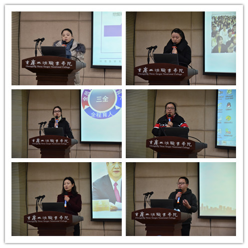 各二级学院代表根据抽签顺序依次发言。经济管理学院卢文凤介绍了学院“五育并举,师生同步,以德为先,差异管理”的育人体系;农林科技学院徐丹丹汇报了在三全育人为背景下,学院从政治学习、趣味教育和专业实训等方面积极探索新形势下的育人方法;动物科技学院唐弋钦围绕着“全员”、“全程”、“全方位”分享学院在双高建设中的创新开展的育人工作;智能智造学院向红分享了学院“221”育人模式下的班级管理方式;人工智能学院李丹凤阐述了学院紧密围绕职业教育特点,构建“5456”育人新模式;汽车工程学院魏巍围绕着自己作为辅导员的“六字体会”,分享自己理解的三全育人。