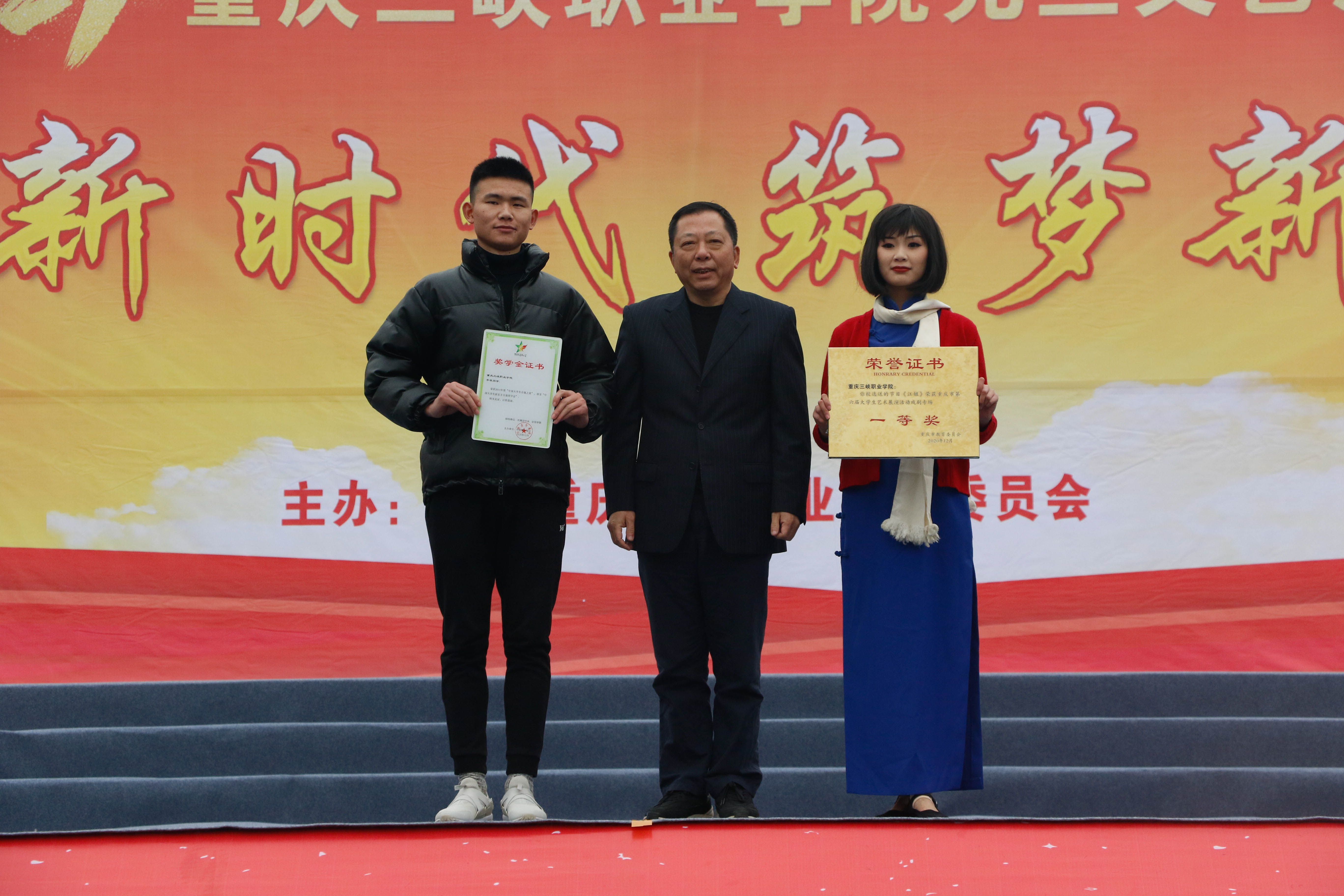 2020年,重庆市第六届大学生艺术展演活动围绕“奋斗·创新·奉献”的主题,展现当代大学生与中国共产党同行、与祖国同行、与时代同行、与人民同行、与梦想同行的价值追求。全市共有46所高校参加展演活动,我院勇夺了戏剧专场一等奖。在共青团中央、全国学联指导开展的2019年度“中国大学生自强之星”评定活动中,我院学子李银荣获了2019年度“中国大学生自强之星”荣誉称号。陈章书记为获奖节目代表和李银同学颁奖。
