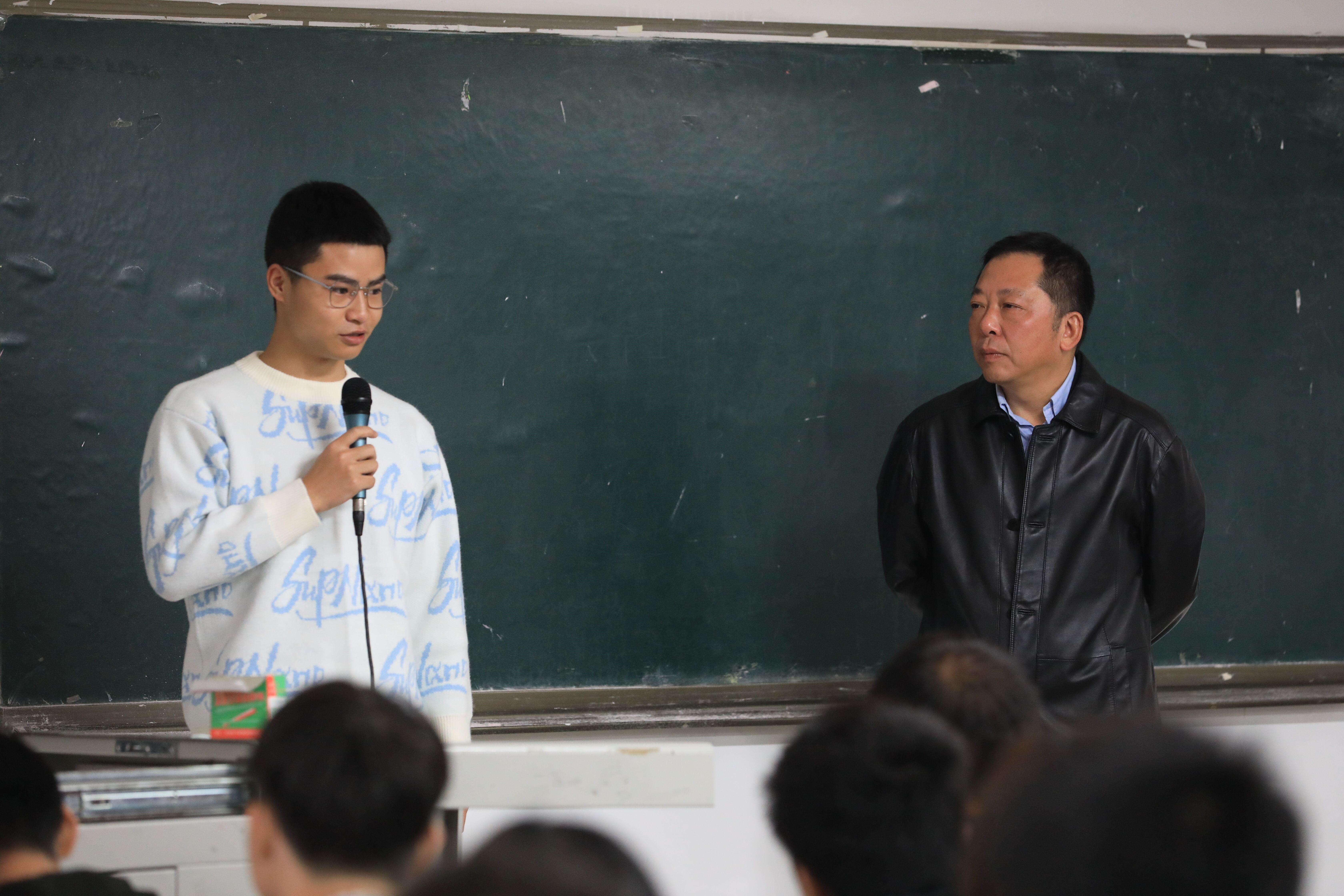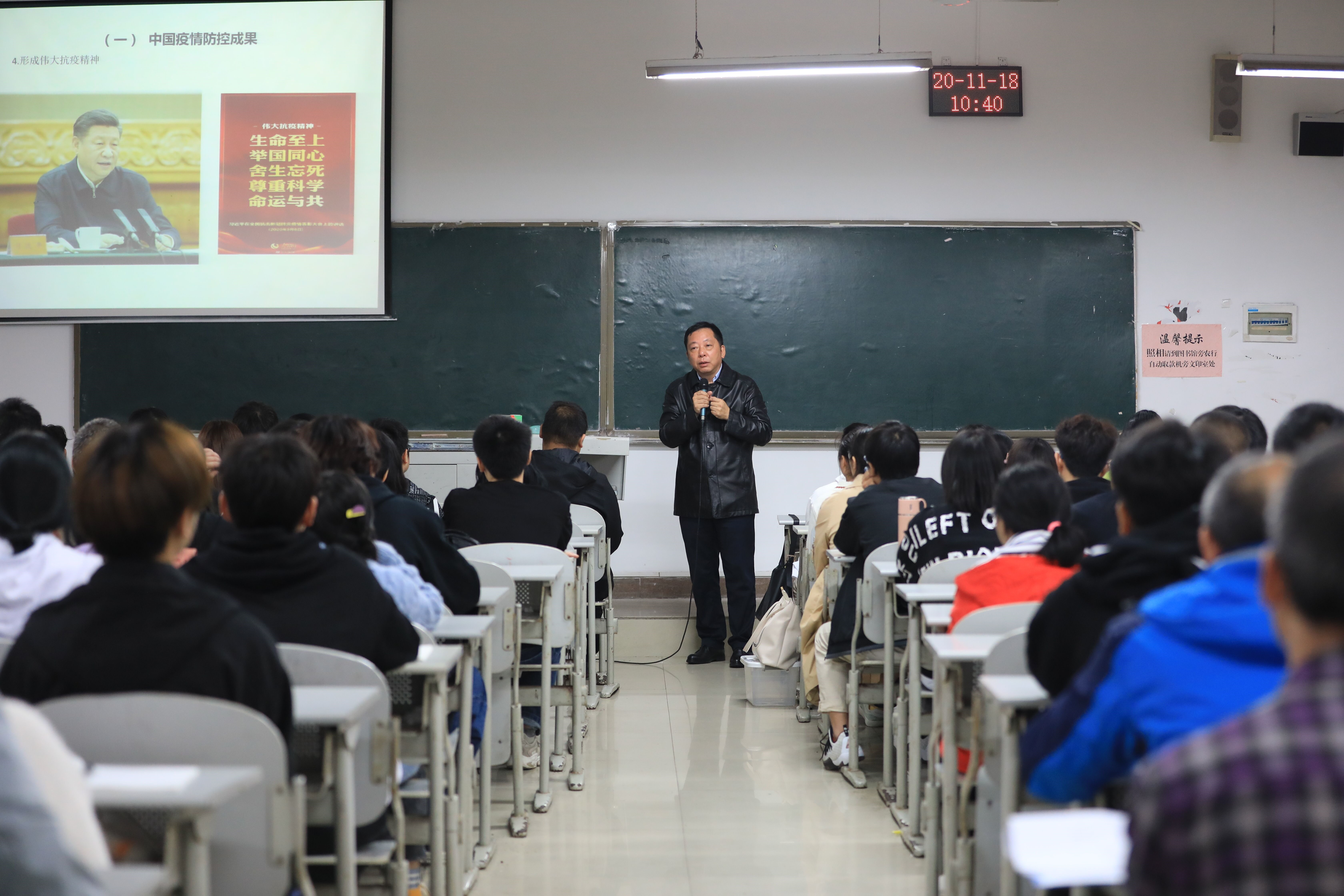 11月18日上午,在学院博雅楼106教室,学院党委书记陈章以“抗疫大考中的中国制度优势”为主题,为动物科技学院2020级畜牧兽医7班和8班的学生上了一堂精彩生动的思政课。