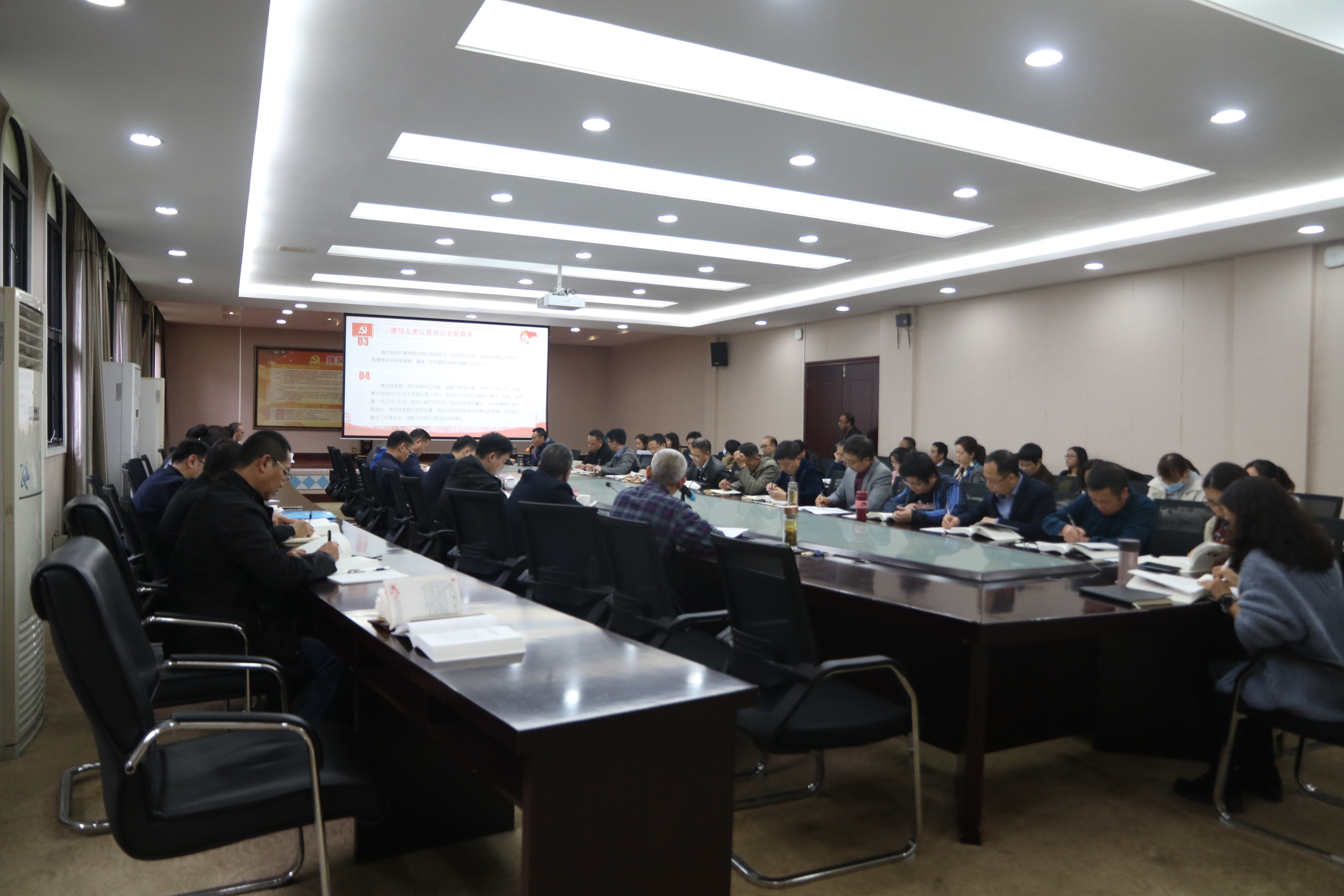 学院党委宣传部部长姜荣带领参会成员集体学习了《习近平谈治国理政》第三卷第五专题之《全面完成决胜全面建成小康社会各项任务》《谱写人类反贫困历史新篇章》《全面打好脱贫攻坚战》《着力解决“两不愁三保障”突出问题 》等四个篇目。