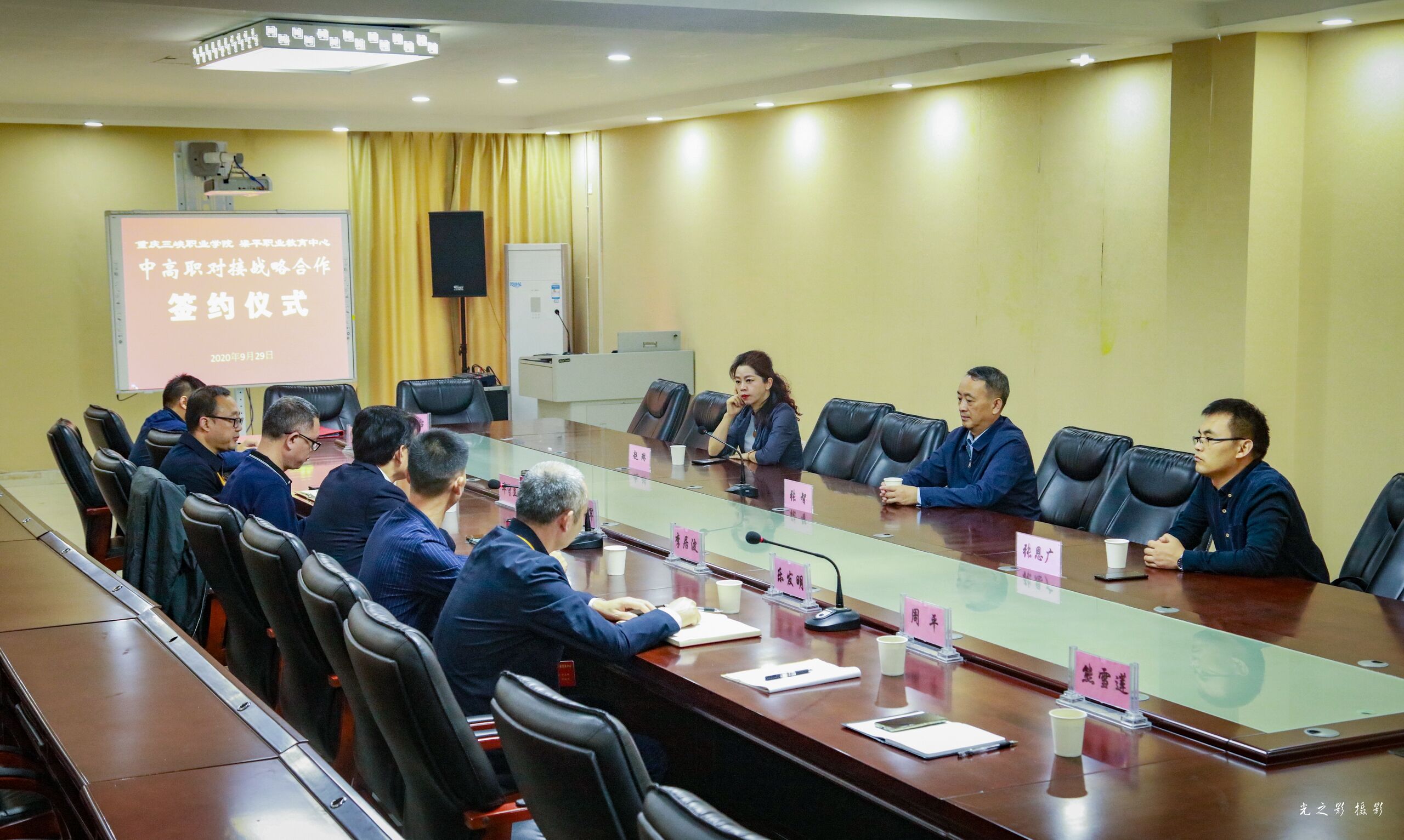 在梁平职业教育中心办公室,双方就办学理念、办学特色、专业设置、产教融合、技能大赛、发展前景进行了深入交流,在旅游管理、家政服务与管理、电子商务、物流管理等专业“3+2”中高职对接合作方面达成一致意见并签署了战略合作协议。