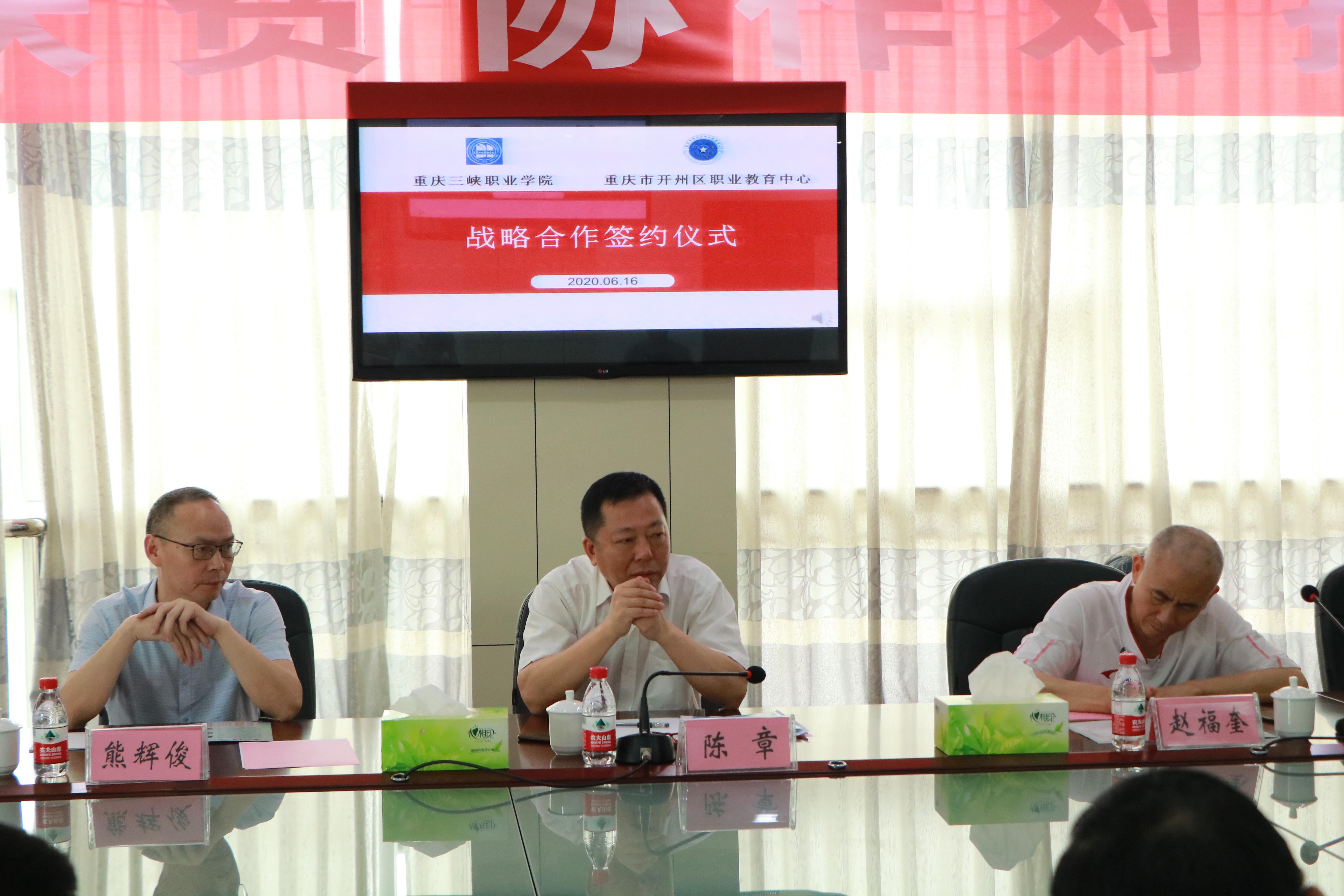 签订仪式在开州区职教中心开物楼仁德厅举行。王蜀明校长首先对陈章书记一行的到访表示了热烈欢迎,结合当前开州区职业教育发展区位条件情况和该校基本校情,介绍了该校面临的发展问题和发展思路,积极响应了学校提出的建立成渝地区双城经济圈万达开区域职业教育发展联盟的倡议,对推进联盟相关工作提出了建议。