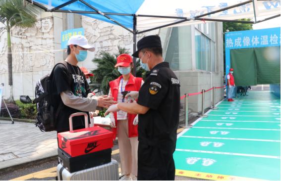 口罩虽然遮住了同学们的面容,但挡不住同学们返回校园的喜悦心情。在学校前后两个校门的返校通道,返校学生在工作人员的引导下,按照分流通道和地面标识间隔排队,进行体温测量、个人身份核验、健康证明核查,在洗手消毒、行李消毒之后,前往学院报到处完成入校报到,整个返校报到流程有条不紊,井然有序。