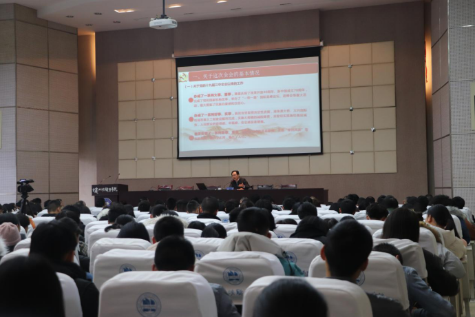 路伟书记的宣讲报告紧紧围绕习近平总书记在党的十九届四中全会上的重要讲话精神和全会审议通过的《中共中央关于坚持和完善中国特色社会主义制度、推进国家治理体系和治理能力现代化若干重大问题的决定》,深度解读了坚持和完善中国特色社会主义制度、推进国家治理体系和治理能力现代化的重大意义,全面阐释了《决定》提出的总体要求、总体目标和重点任务。报告还传达学习了市委五届七次全会精神,并紧密结合实际,以“脱贫攻坚战”、“三峡百万移民”为例,阐释了中国特色社会主义制度和国家治理体系的显著优势,为师生上了一堂生动的思想政治课。