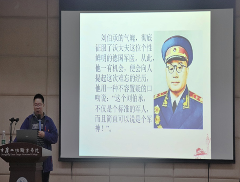 吴琼老师声情并茂地讲述了刘伯承在战争中右眼中弹受伤,在治疗过程中为了不损害脑神经,强忍钻心疼痛,坚持不用麻药,被主刀医生赞叹为“军神”的感人故事。吴琼老师在宣讲会临近结束时表示,在曾经的那段日子里,有过太多的英雄先烈,抛头颅,洒热血,才有如今繁荣富强的新中国,我们应当牢记历史,颂扬英雄。