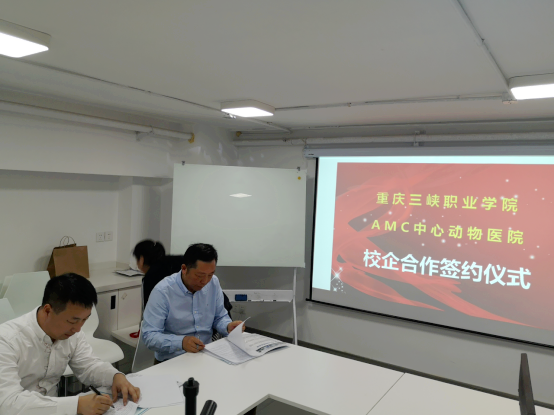 陈章书记一行参观了AMC分院的诊疗室、检验室、手术室,并看望了我校17级宠物班的实习生赖佳同学,勉励该生认真学习诊疗技能,全面提高自己。陈章书记一行考察了AMC最大的医院—AMC河西中心动物医院,在董颖波董事长的细致介绍下,察看了该院20余个科室,对该院先进的诊疗设备、高超的诊疗技术、人性化的管理理念高度赞赏。陈章书记代表学校与董颖波董事长签订了校企合作共建实训基地协议。