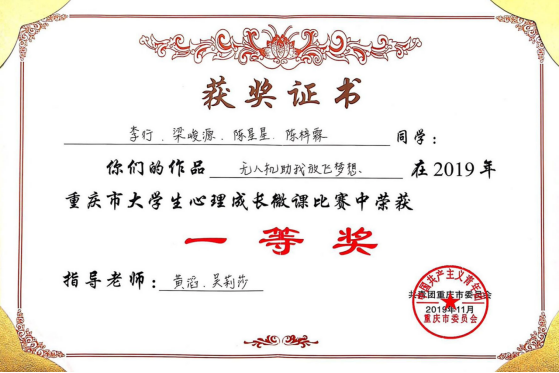 11月2日,2019年重庆市大学生心理成长微课比赛决赛在重庆医药高等专科学校举行,我校黄滔、吴莉莎老师指导,智能制造学院李行、梁峻源等4名学生主讲的《无人机助我放飞梦想》作品,最终脱颖而出,获得一等奖。