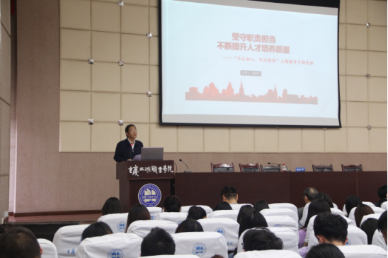 杨和平校长结合新时代下职业教育发展特点,高职扩招发展空间,我校职业教育发展取得的成效,从以下四个方面对新时代职业教育的初心进行了解读。一是坚守职责担当是主题教育的具体目标之一;二是坚守职责担当是新时代职业教育改革发展的必然要求;三是坚守职责担当是破解扩招后提升人才培养质量的必然要求;四是扩招后提升人才培养水平的对策思考。