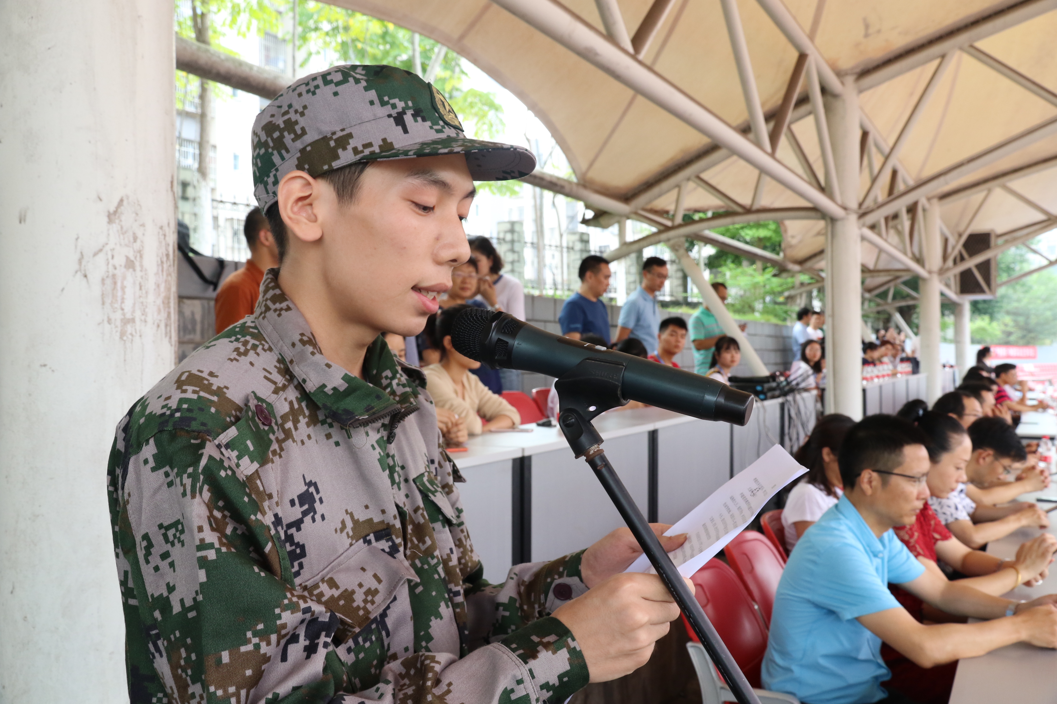 军训学员代表贺如栋上台发言,他表示要在军训中磨练自己,使自己变得更坚强、更勇敢、更自律,为建功新时代而努力塑造自己,雕琢自己。