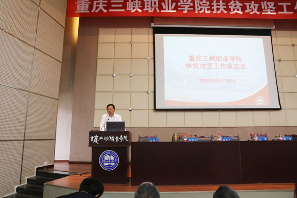 5月16日下午,重庆三峡职业学院扶贫攻坚工作报告会在博雅楼学术报告厅召开。市教委扶贫集团、万州区扶贫办、万州区白土镇大林村主任以及学校3位驻村第一书记在报告会上先后发言,校党委书记陈章发表讲话。校长杨和平等学校领导出席了报告会,副校长赵福奎主持大会。
