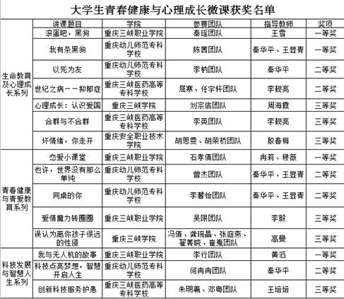 5月14日,重庆市第十届大学生成长论坛万州片区预赛在我校成功举行。我校参赛团队在此次比赛中表现突出,成绩显著,我校所选送的微课在此次大学生青春健康与心理成长微课比赛中获得三个一等奖。