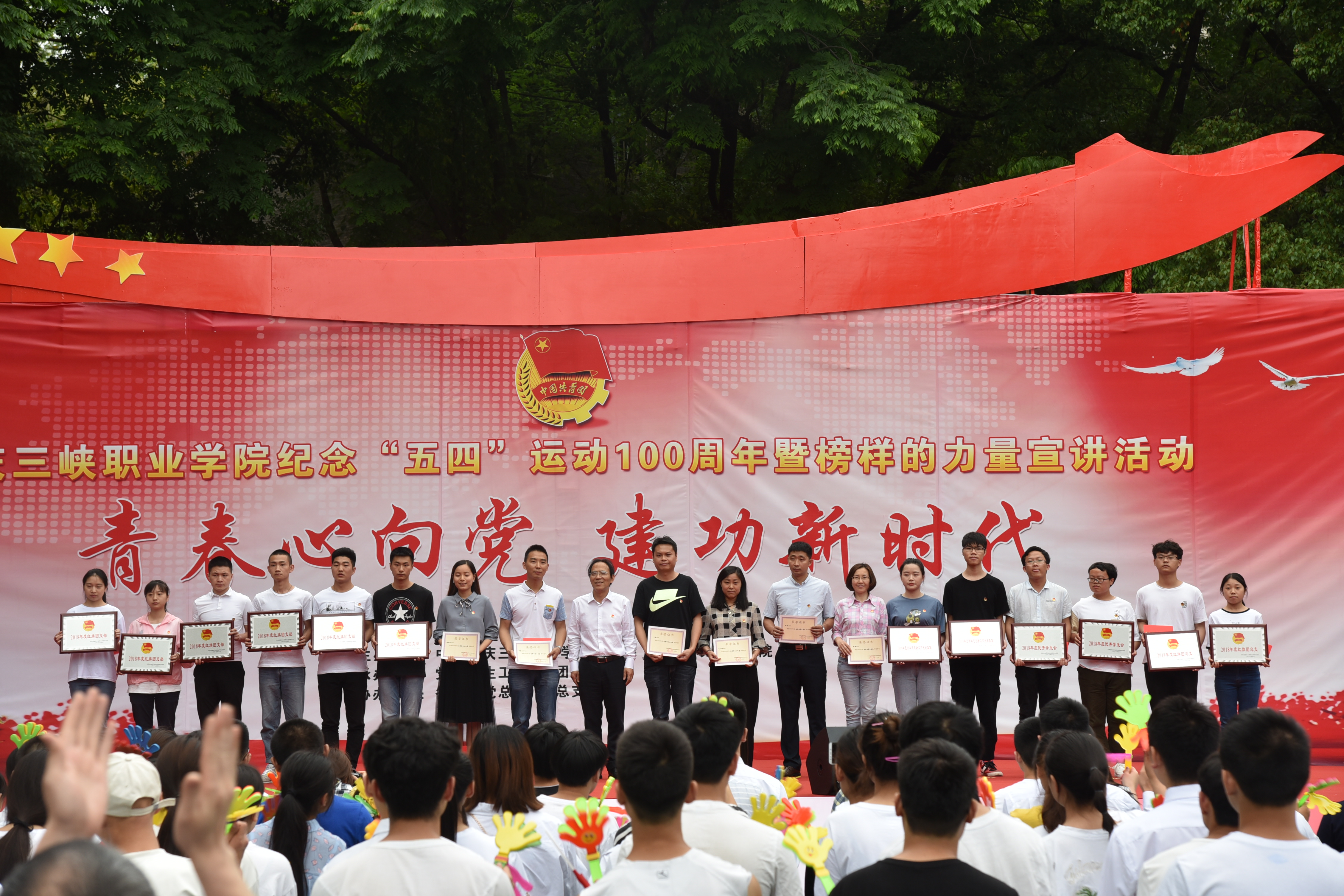 学校领导对红旗团总支、红旗团支部等35个先进集体和优秀团务工作者、优秀共青团干部、优秀共青团员等804名优秀个人进行了现场表彰。