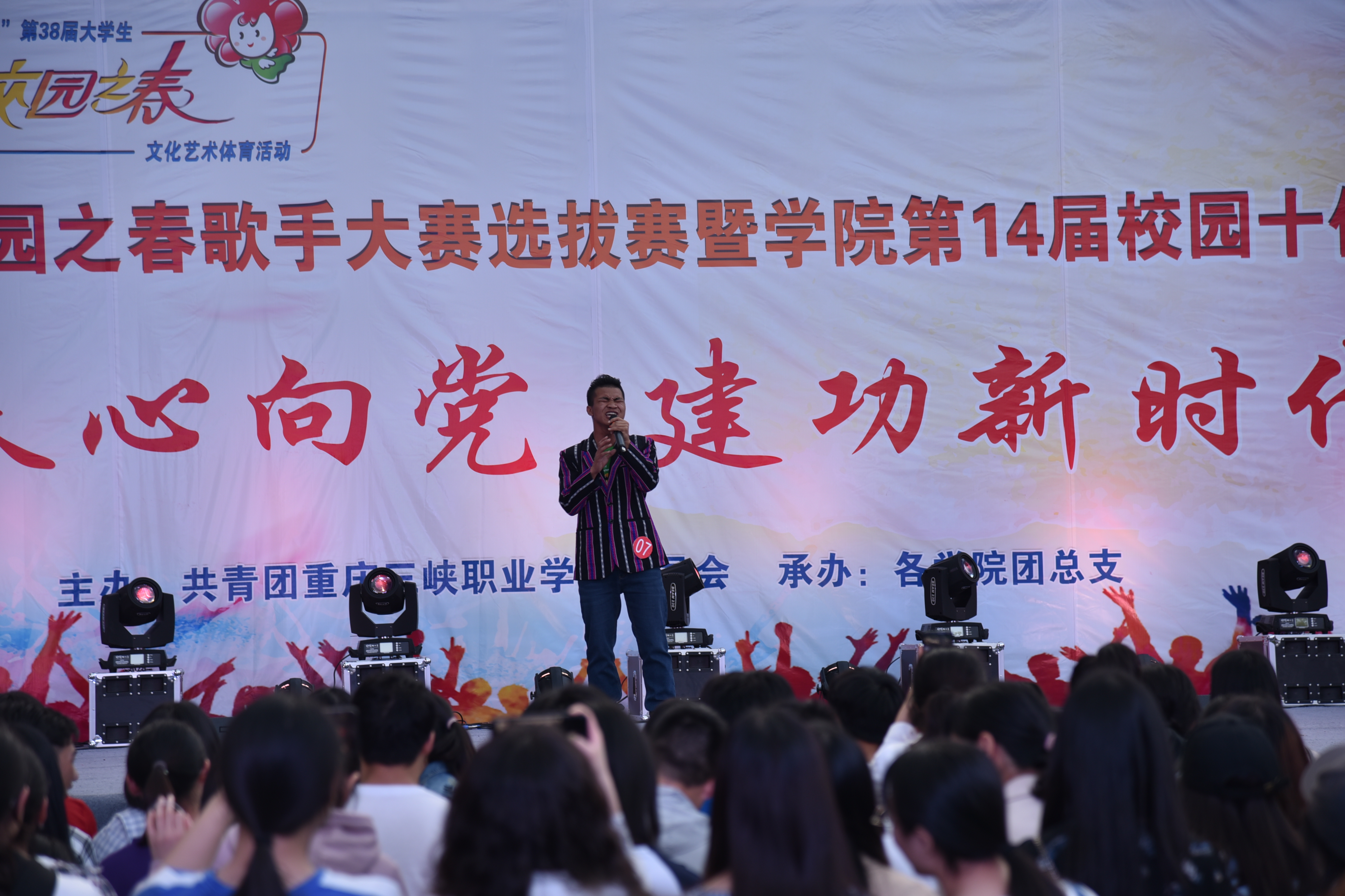 4月11日晚18:00,重庆市第38届校园之春歌手大赛选拔赛暨重庆三峡职业学院第十四届校园十佳歌手决赛在羽毛球场成功举办。重庆市音乐家协会会员、万州区音乐家协会副主席古光炼,重庆幼儿师范高等专科学校音乐教育系副教授吴隽,重庆市音乐家协会会员、声乐教师卢丽娟,重庆市音乐家协会会员、万州区青年声乐教师谭霞,万州区音乐家协会会员、学校合唱团指导教师吴丽莎担任评委。学校党委委员、副校长杨建宏副教授,学工部、团委部门负责人,各学院团总支书记与1000余名同学共享了这场视听盛宴。