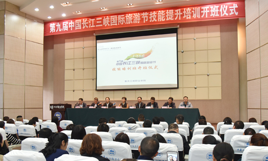 10月16日上午,第九届三峡国际旅游节技能提升培训在重庆三峡职业学院顺利开班。万州区副区长蒋艺义、学院党委书记陈章、院长杨和平等,区交委、区移民局、区商务局、区旅游局、团区委等的分管领导以及两期参训学员共700余人参加了开班典礼。区旅游局副局长胡雄主持开班典礼。