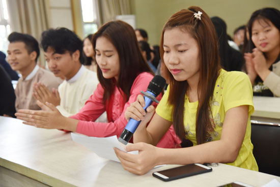2017届缅甸生代表孔明同学,用一口流利的汉语和新生们分享了他在校期间的学习经历,孔明同学上台用中文分享他的“中国故事”的同时,另一名留学生进行缅语同期声翻译,看到学长们流利的汉语言水平、自信的讲述,让缅甸2018级新生们对勤奋、优秀的学长充满了敬佩,同时也对即将开始的留学生活充满了期待。