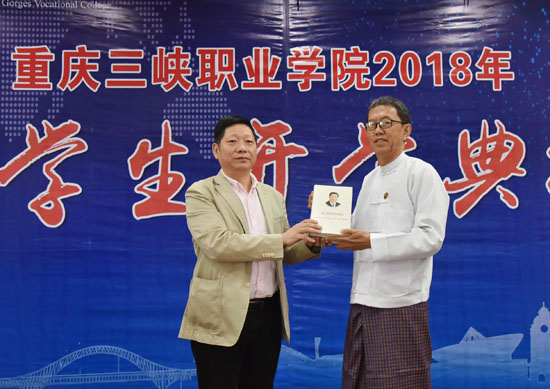 缅中友协负责人吴胜钮先生对学院的留学生工作安排处处体现的周到、细致表示感谢,2017届学生在校期间,生活学习都很愉快,同时他感到学生们在一年多的留学生活中,成长很快,进步很大,他表示很欣慰,感谢学院领导、老师、中国学生们一直以来给与的关怀和帮助。他对新一届的留学生们提出希望,希望他们带着国家、家长、老师们的期盼,在重庆三峡职业学院学好职业技能,刻苦努力,学有所成,将来报效国家。