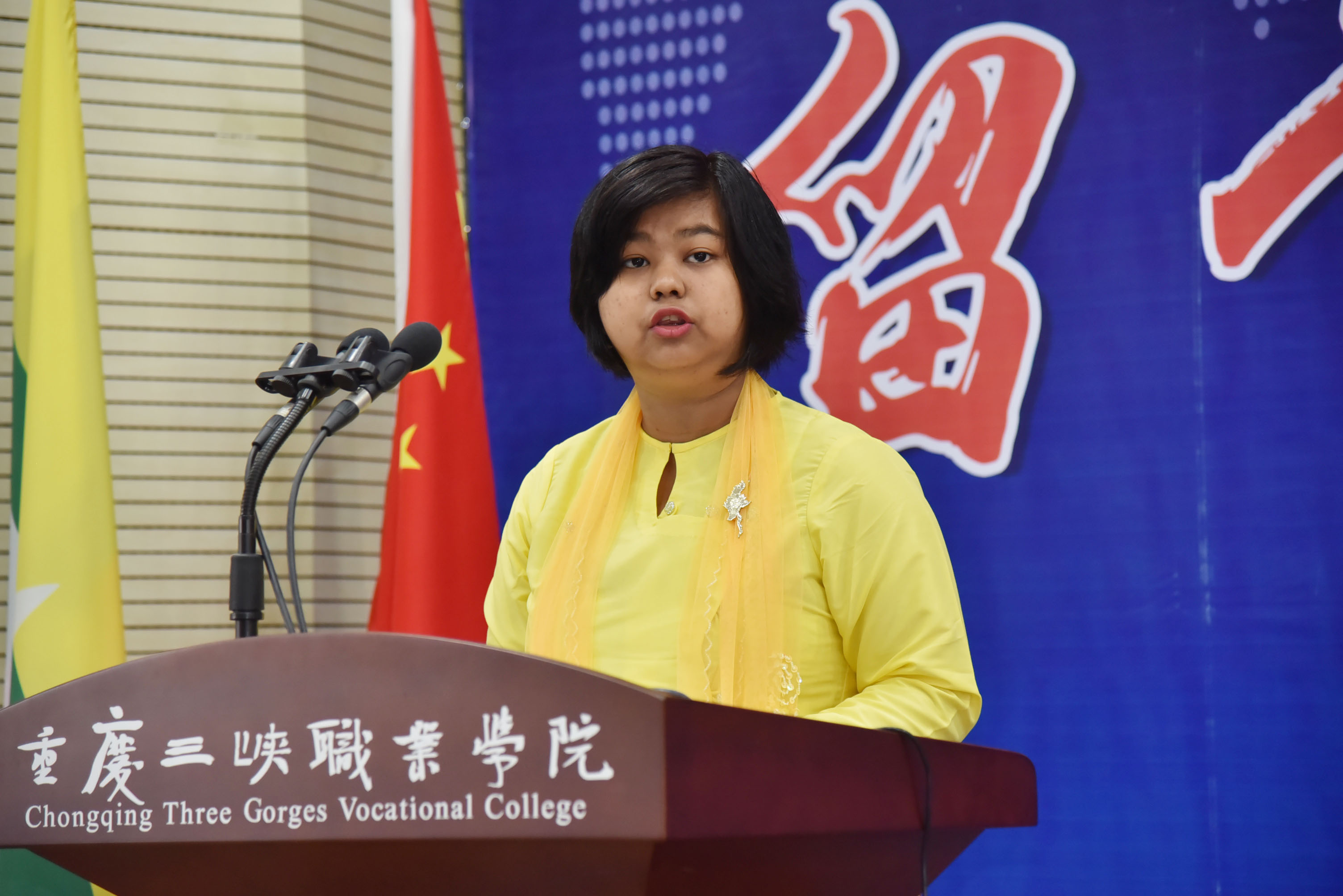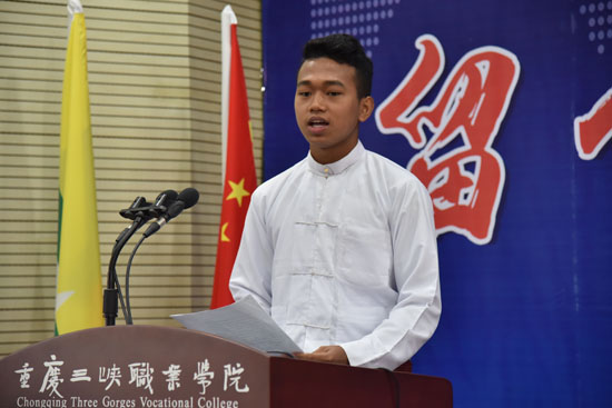 新生代表也上台发言,她表示,很有幸来到中国,来到重庆三峡职业学院学习,自己在来之前已经充满了期待,到校后看到学院优美的环境、热情的师生让我更是对以后的生活学习充满了信心。