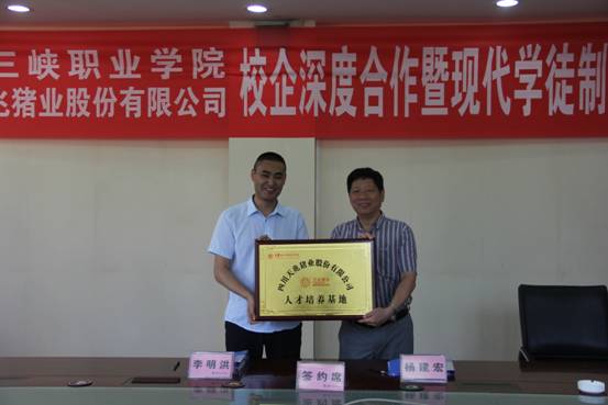 随后,四川天兆猪业股份有限公司人力资源部总监李明洪和学院副院长杨建宏分别代表公司和学院在校企合作协议上签字并进行授牌仪式,宣告校企双方合作办学进入践行阶段。协议约定,2018年在畜牧兽医专业开办现代学徒制试点“天兆”班,每班约30人。学院在企业建立实习实训基地,企业在学校建立“天兆养猪学院”人才培养基地。