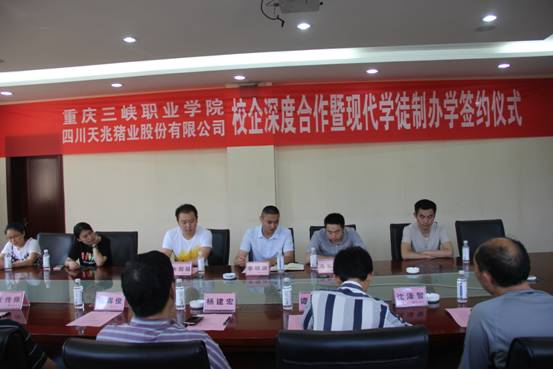 6月13日上午,“重庆三峡职业学院、四川天兆猪业股份有限公司校企深度合作暨现代学徒制办学签约仪式”在学院行政楼二楼会议室隆重举行。学院副院长杨建宏,招生就业处、动科系、党政办等部门负责人出席了会议。
