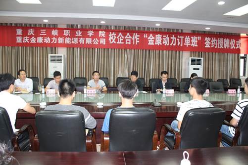 5月24日下午,重庆三峡职业学院与重庆金康动力能源有限公司首届“金康动力订单班”签约仪式在在学院行政楼三楼会议室举行,学院副院长杨建宏、重庆金康动力能源有限公司电驱动工厂总经理徐小川以及人事行政主管朱品容等出席会议。