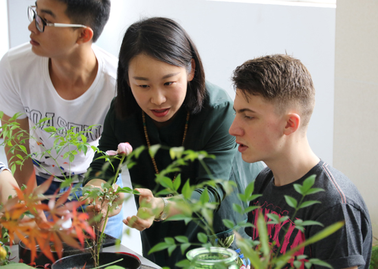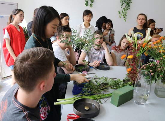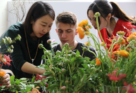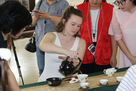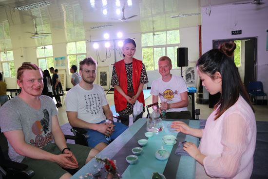 经济贸易系的中华茶艺表演给比利时师生们带来了中华茶文化独特的意蕴之美和情景体验。他们也按捺不住好奇和兴奋,纷纷端坐于桌前,听茶艺师生们一步步演示和讲解中华茶艺的主要步骤,然后调呼吸,学手势,他们都要泡一壶自己的中国茶。