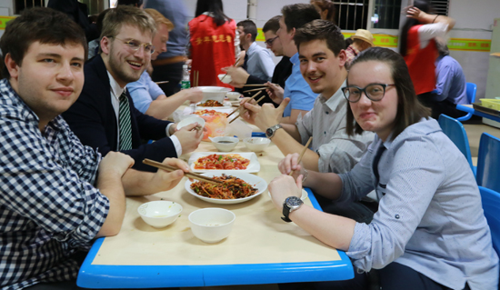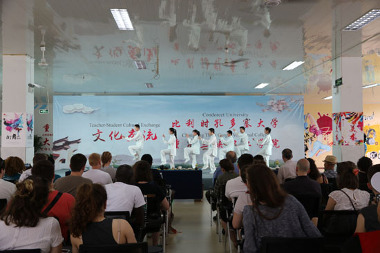 到了中国,深厚的中国传统文化是外国朋友们都极感兴趣的。传统文化交流在大学生艺术活动中心开展。学院优秀学生社团——武术协会的同学们为大家现场展示了中国武术,同学们身姿敏捷,爆发有力,翻转腾跃间体现了中国武术的博大精深。同学们现场还向外国朋友们教授中华传统武术套路,比利时师生们竞相体验。