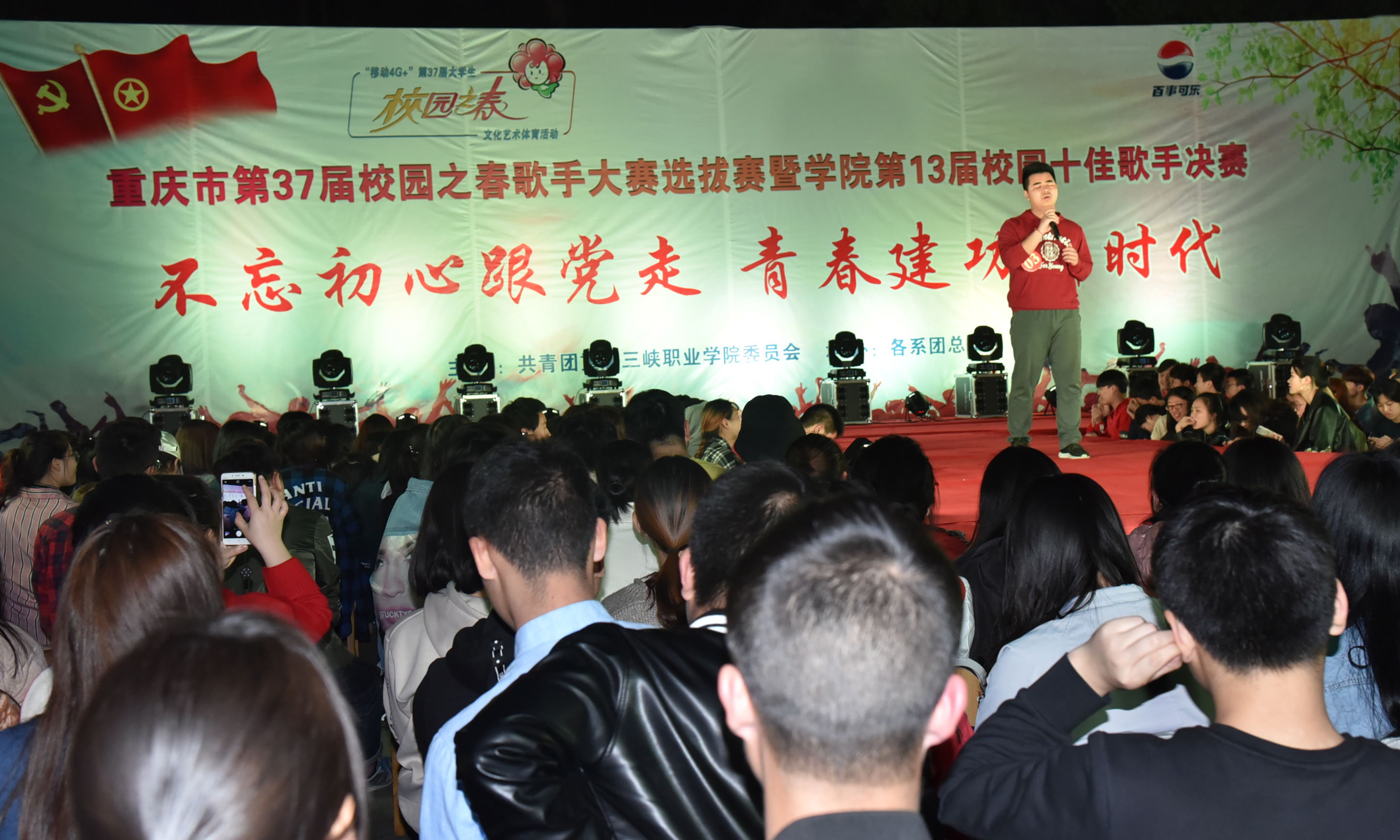 3月29日晚,重庆市第37届校园之春歌手大赛选拔赛暨学院第13届校园十佳歌手决赛在羽毛球场成功举办。重庆三峡歌舞剧团团长蒲庆云、万州区文化馆副馆长易良军、重庆三峡歌舞剧团副团长李伍华、学院大学生艺术团合唱团指导教师吴莉莎四位老师担任评委。学工部、团委部门负责人、各系团总支书记与1000余名同学共享了这场视听盛宴。