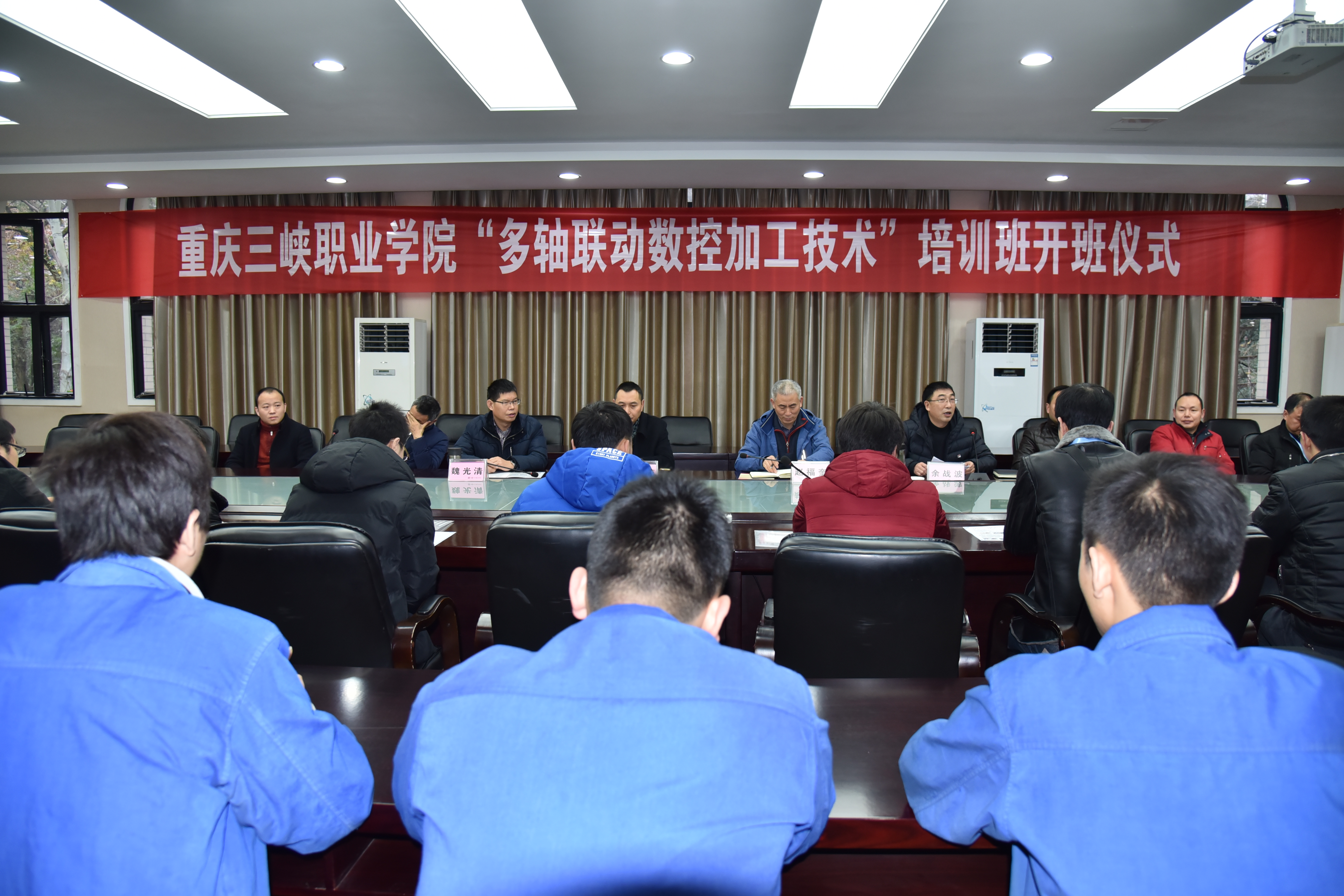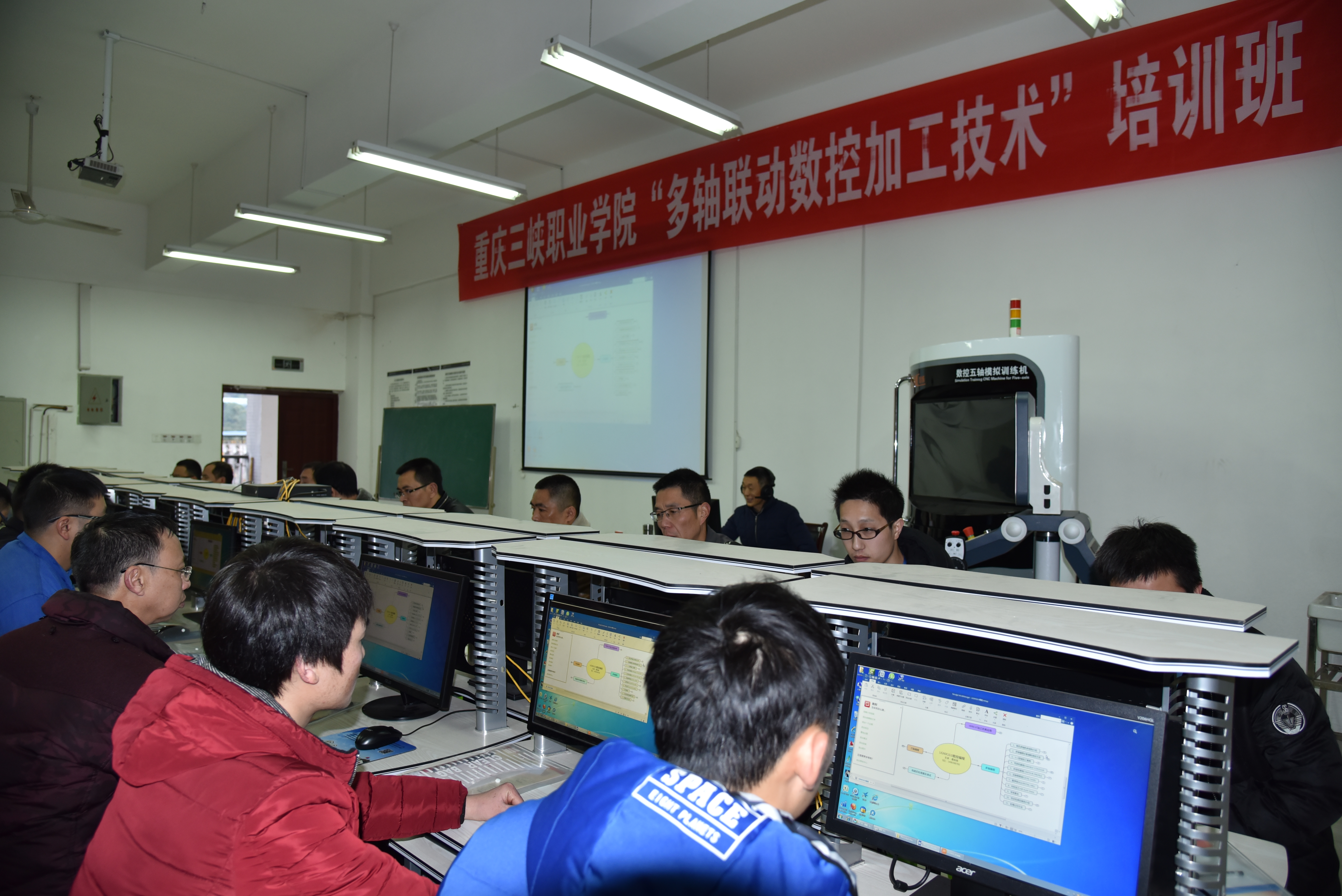 为了深入贯彻十九大精神,本着职业教育为地方经济建设服务的宗旨,1月5日—7日,学院承办了首届三峡库区智能制造—“多轴联动数控加工技术”企业院校培训,机械与电子工程系主要承担此次培训任务。此次培训的学员来自中国船舶重工集团衡远科技有限公司、重庆江东机械有限公司等8个单位共计31名技术骨干,机械与电子工程系数控技术教研室易良培、魏向京、朱鸿、李望飞等教师进行培训指导。