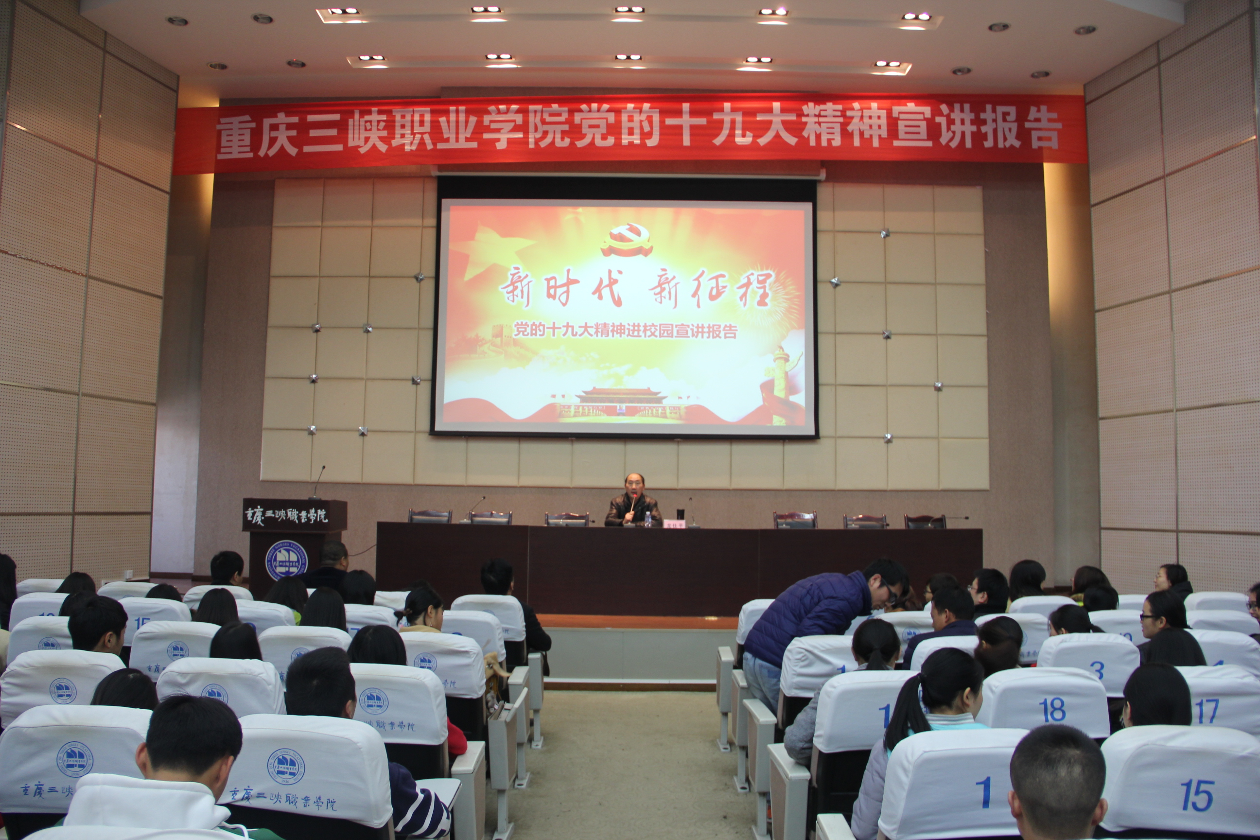 报告会上,龙仕平书记从党的十九大概况、新时代党的建设、建设教育强国三个部分作了宣讲。报告重点围绕党的十九大完成的五项任务、十九大主题的四层含义和三大主要成果、新时代中国特色社会主义思想、坚持和发展中国特色社会主义的基本方略、新时代党的建设总要求、优先发展教育等七个方面,对党的十九大精神进行了全面系统的阐释,系统回顾了十八大以来教育改革发展的历史性成就和所处的方向,展望教育事业美好未来,提出对青年的期待。