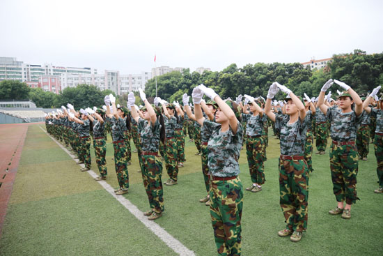 由200名男女生组成的军体拳表演方队,精准的踢、打、摔、拿、拧,动作精炼、节奏分明,充分展现了力量和阳刚之美。400名男女组成的团体操方队带来的手语操表演,他们身姿挺拔、动作一致、口号洪亮、精神焕发,显示出蓬勃的朝气和昂扬的斗志。军训团的8名教官组成的擒敌术表演,出拳动作干脆,变化多样,展现了军人的英武气质和过硬的擒敌本领。