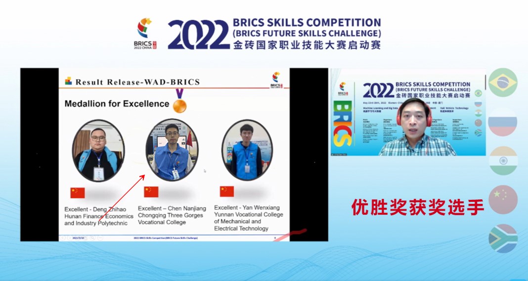 5月25日-28日,2022金砖国家职业技能大赛启动赛Web技术赛项于线上成功举办,人工智能学院陈南江同学,在弋才学老师指导下,与巴西、俄罗斯、印度、中国、南非等金砖五国参赛选手同场竞技,在“Web技术”赛项中获第八名(二等奖)的好成绩。