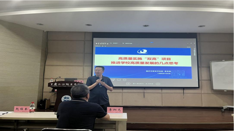 为有效推动学院双高建设,7月8日,双高办特邀请重庆市教育评估院职成所黄承国所长到校指导双高建设工作并开展双高专题讲座。学院党委书记陈章、院长李炯光及在家院领导共同参与本次培训。会议由党委委员、副院长袁德梽主持。