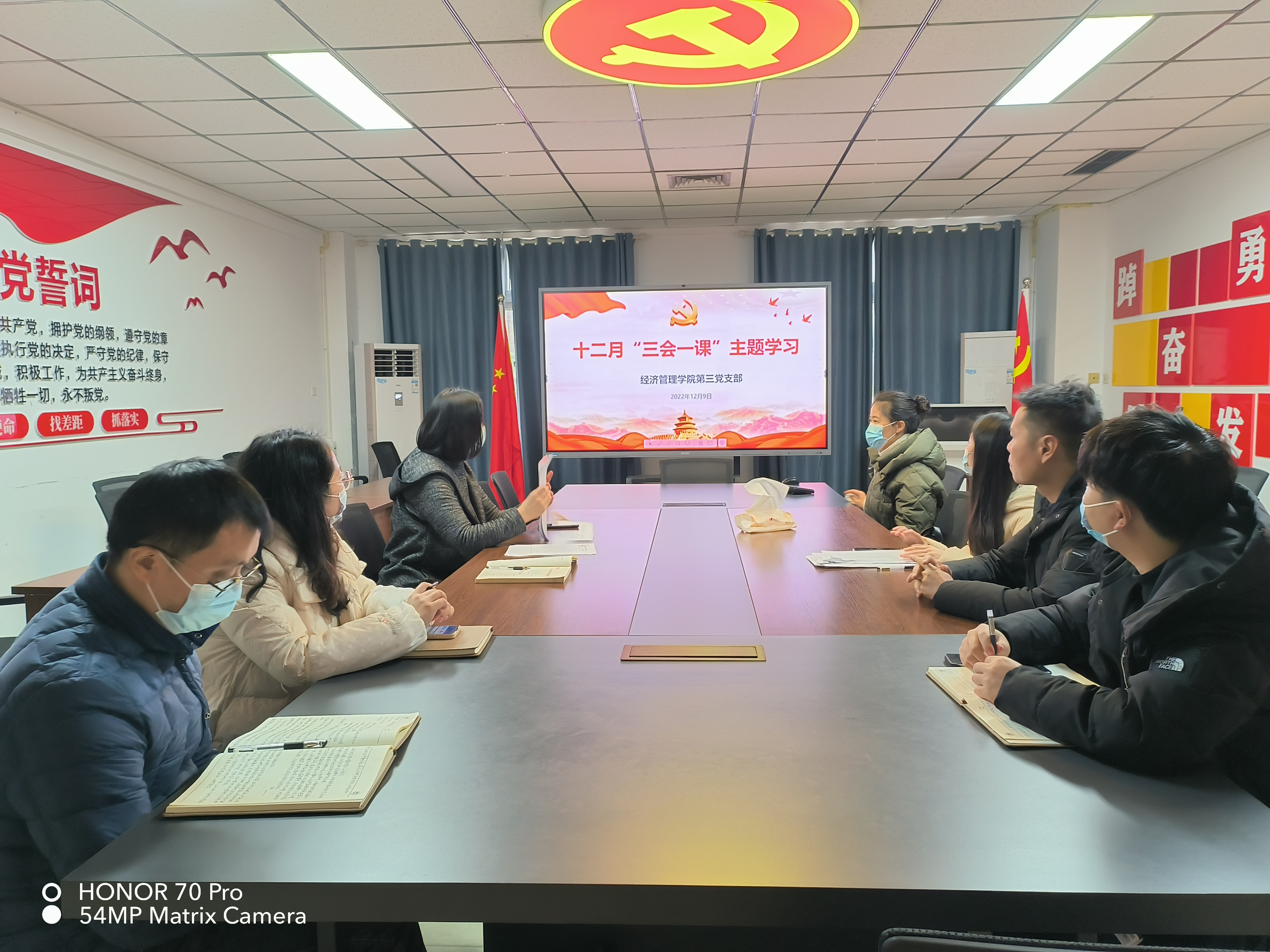 为进一步深入学习宣传贯彻党的二十大精神,深刻领会党的二十大的重大意义、丰富内涵,12月9日上午,经济管理学院党总支第三党支部在沙龙校区综合楼二楼会议室召开12月“三会一课”理论学习会,深入学习贯彻党的二十大精神。本次会议由第三支部书记黄巧仙主持,全体党员师生参加。